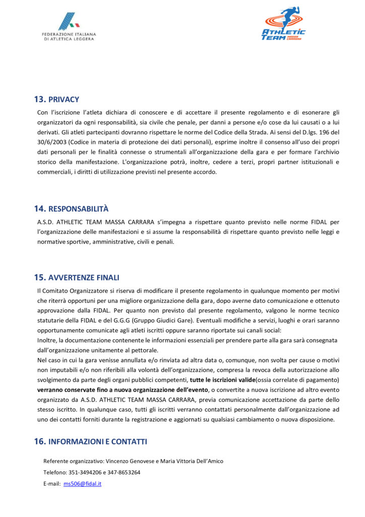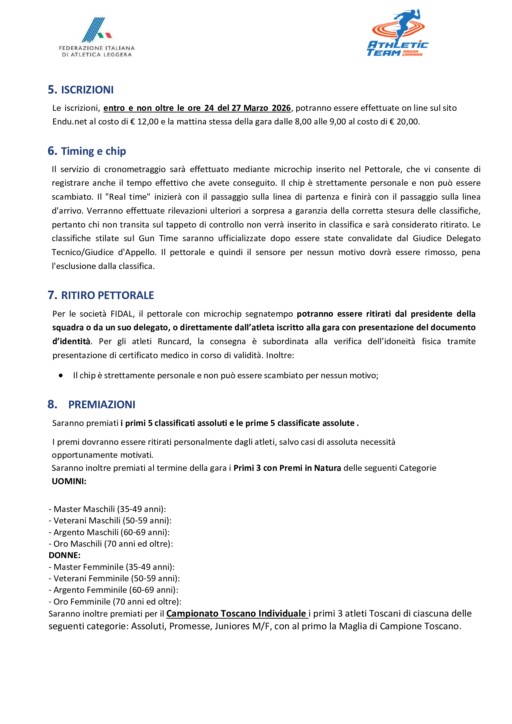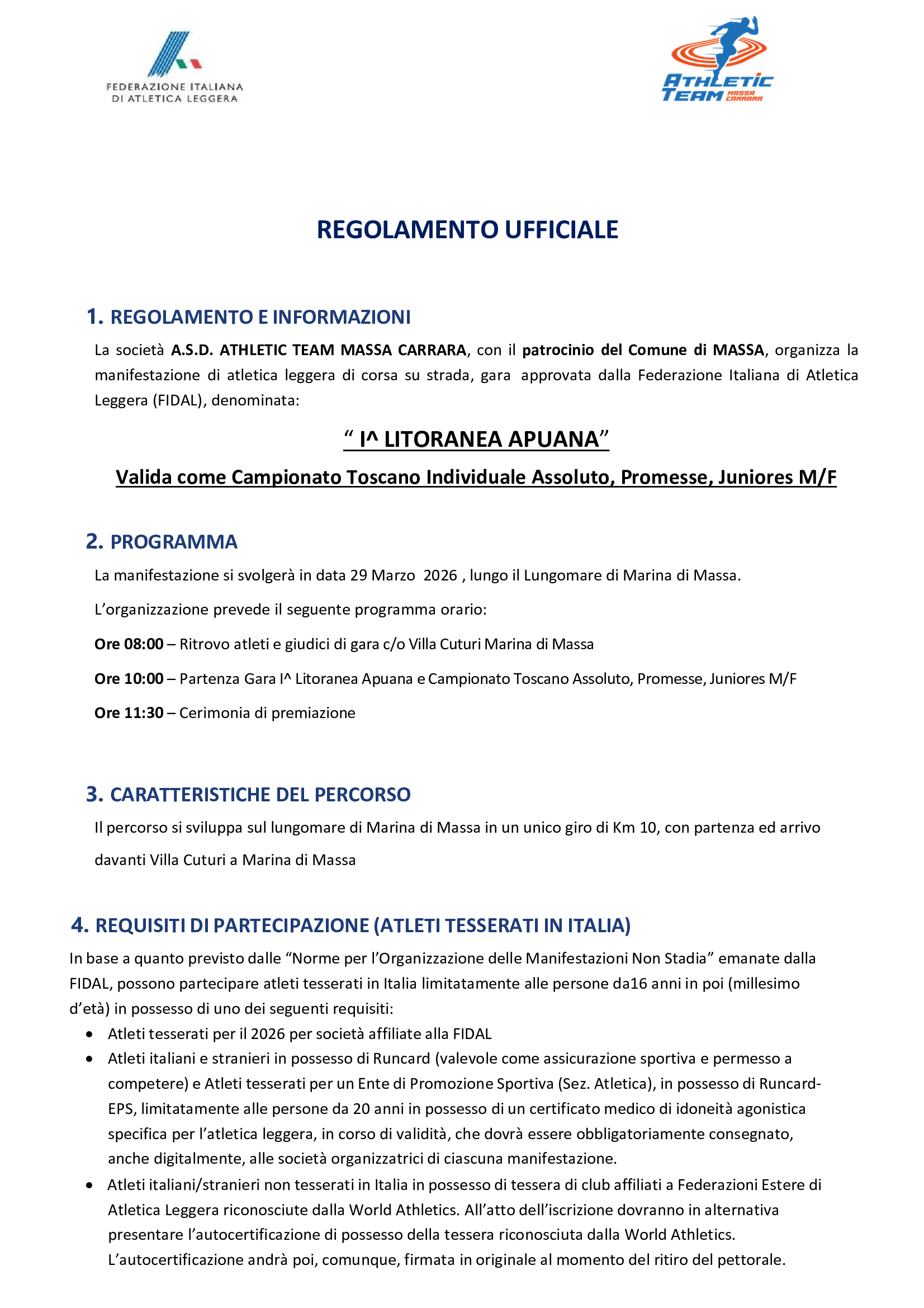 1° Litoranea Apuana Data: 29/03/2026 Località: Massa (Ms) 🏆 🏅 Classifica: Clicca qui 📌 Luogo: Toscana / Massa-Carrara⏰ Orario: 10📏 Distanza (max): 10 km📍 Indirizzo: Massa-Carrara, Toscana, Italia📧 Email: MS506@FIDAL.ITDescrizione: Km 10 Volantino / Regolamento