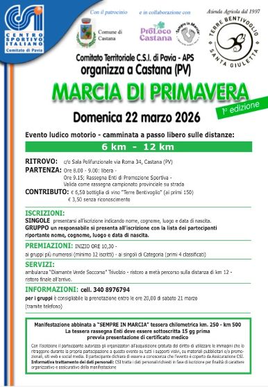 1 ° Marcia di Primavera Data: 22/03/2026 Località: Castana (Pv) 📌 Luogo: Lombardia / Pavia⏰ Orario: dalle 8,00 alle 9,00📏 Distanza (max): 12 km📍 Indirizzo: Sala Polinfunzionale Via Roma 34 Castana PaviaDescrizione: Km 12 - Km 6 Volantino / Regolamento