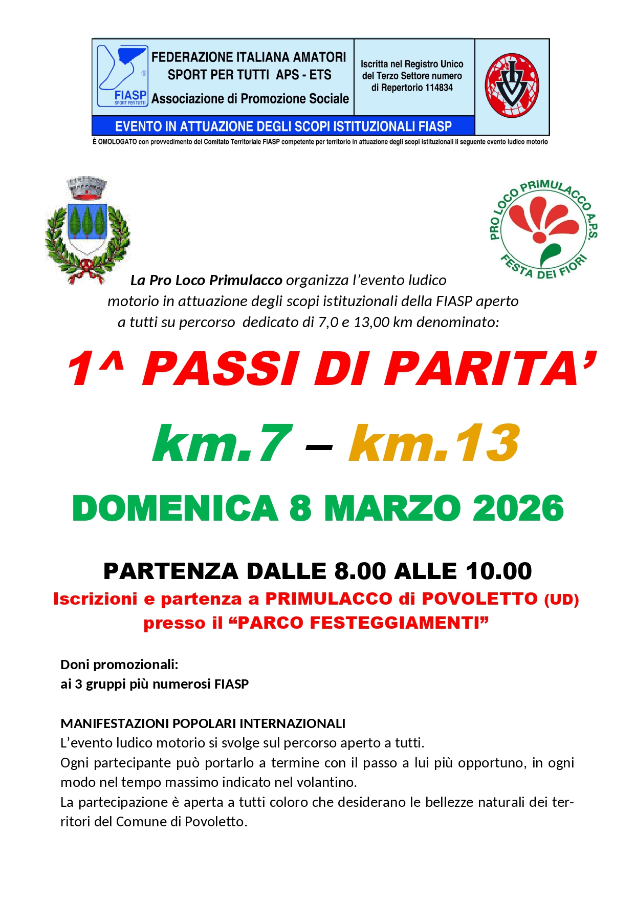 1° Passi di Parita’ Data: 08/03/2026 Località: Primulacco di Povoletto (UD) 📌 Luogo: Friuli-Venezia Giulia / Udine⏰ Orario: 8,00 - 10,00📏 Distanza (max): 13 km📍 Indirizzo: Parco Festeggiamenti Primulacco di Povoletto (Ud)Descrizione: Km 7 - Km 13 Volantino / Regolamento