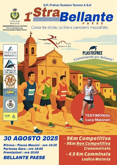 1′ Strabellante Data: 30/08/2025 Località: Teramo (TE) 🏆 🏅 Classifica: Clicca qui 📌 Luogo: Abruzzo / Teramo⏰ Orario: 18:00📍 Indirizzo: Piazza Mazzini BellanteDescrizione: Km 9 competitiva e non Km 4,5 non competitiva Volantino / Regolamento