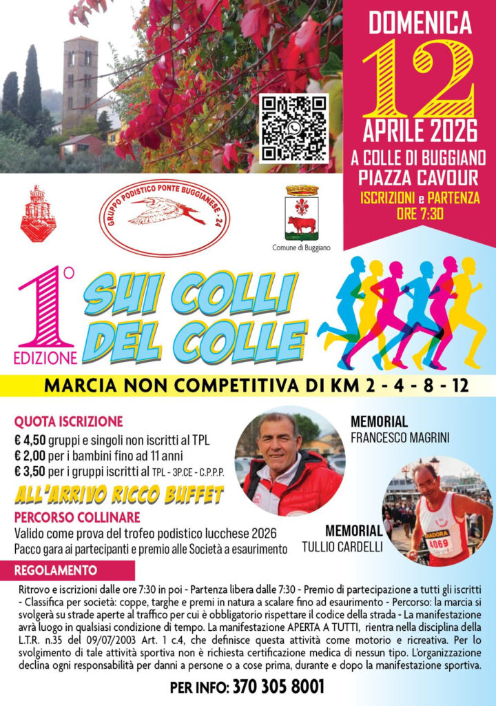 Descrizione: Corsa non competitiva e camminata sui sentieri intorno a Colle di Buggiano. La manifestazione prevede 3 percorsi 12, 8 e 4 km. sarà presente un ristoro sul percorso e il ristoro finale presso la Partenza/arrivo