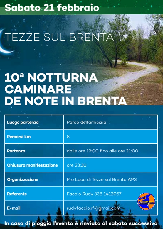 10° Caminare de Note in Brenta Data: 21/02/2026 Località: Tezze sul Brenta (Vi) 📌 Luogo: Veneto / Vicenza📏 Distanza (max): 8 km📧 Email: camminareinbrenta@gmail.com📞 Telefono: 339.3526239Descrizione: Ludico motoria di Km 8. Partenza ore 19:00/21:00 c/o il Parco dell'Amicizia. Obbligatoria Torcia Volantino / Regolamento