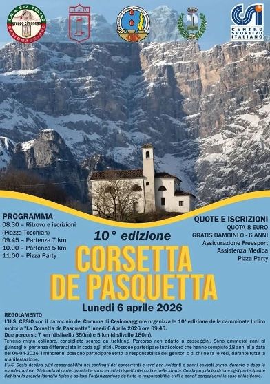 Descrizione: Ludico motoria di Km 7 e Km 5. Partenza ore 09:45 (Km 7) e ore 10:00 (Km 5) c/o la Chiesetta di Toschian