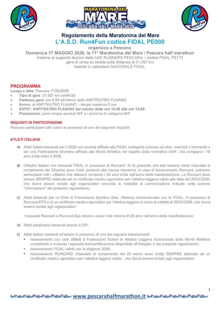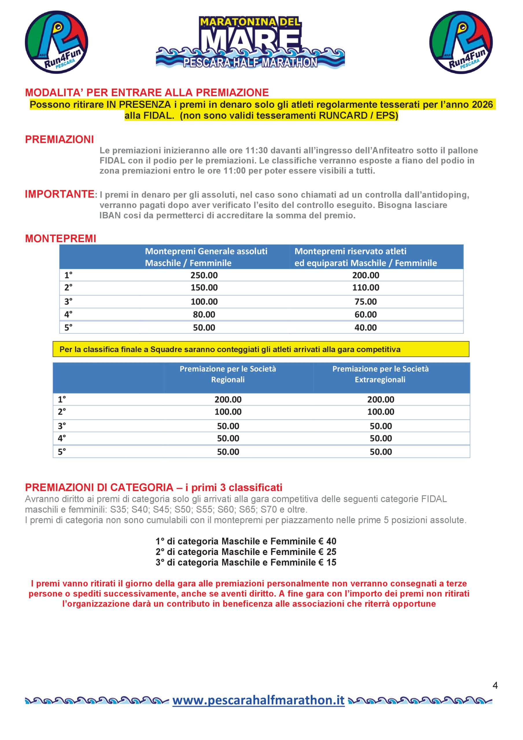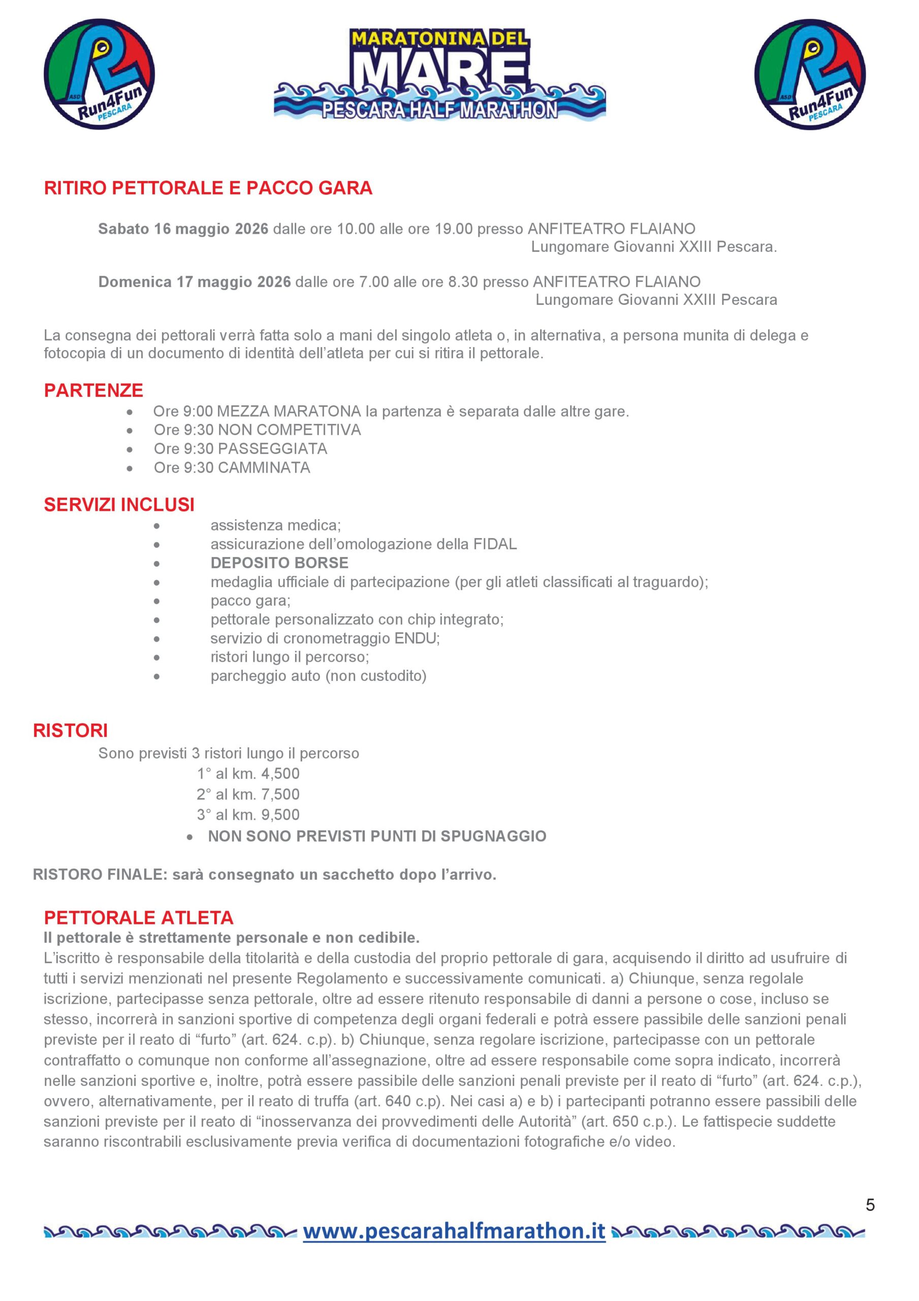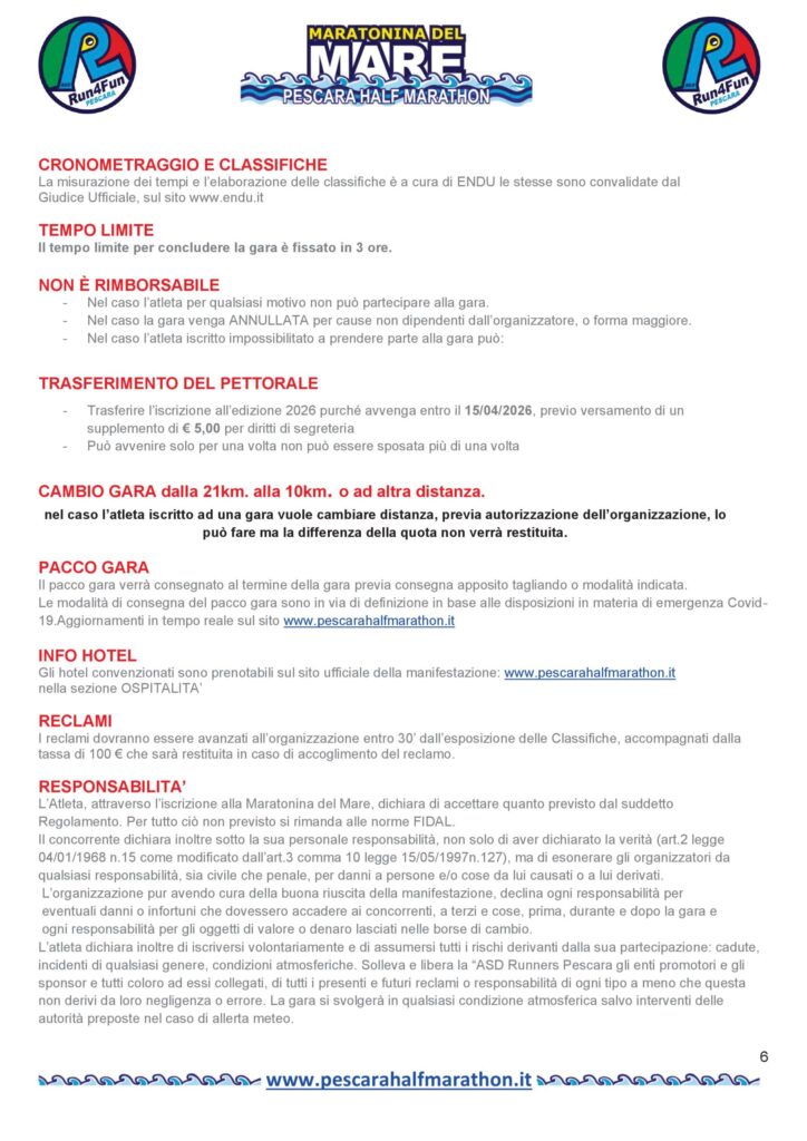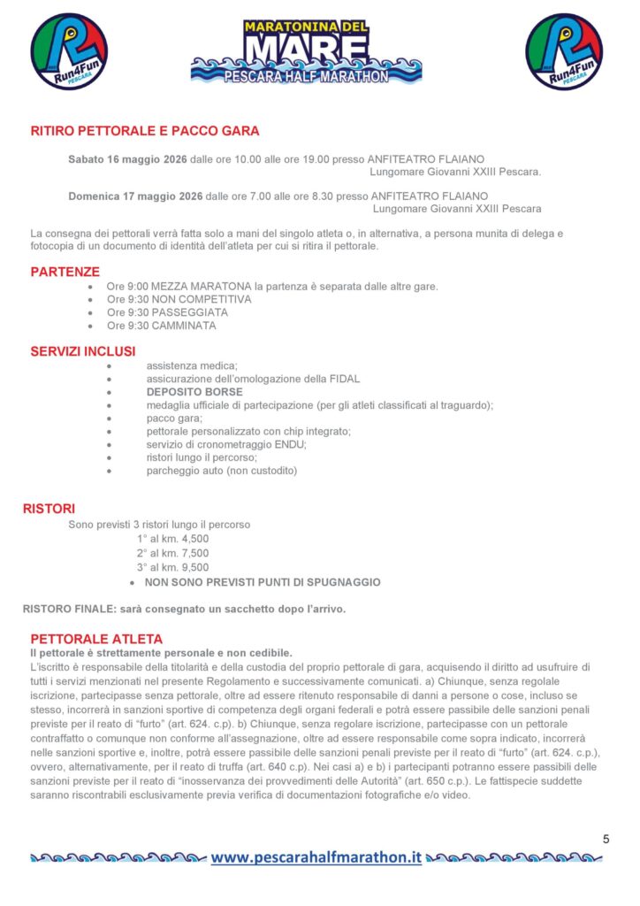 Descrizione: Competitiva di Km 21,097, non compet. di Km 10.5 e Km 6,5 e passeggiata di Km 2,5. Partenza ore 09:00 c/o Anfiteatro Flaiano