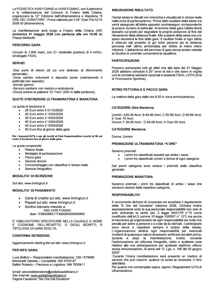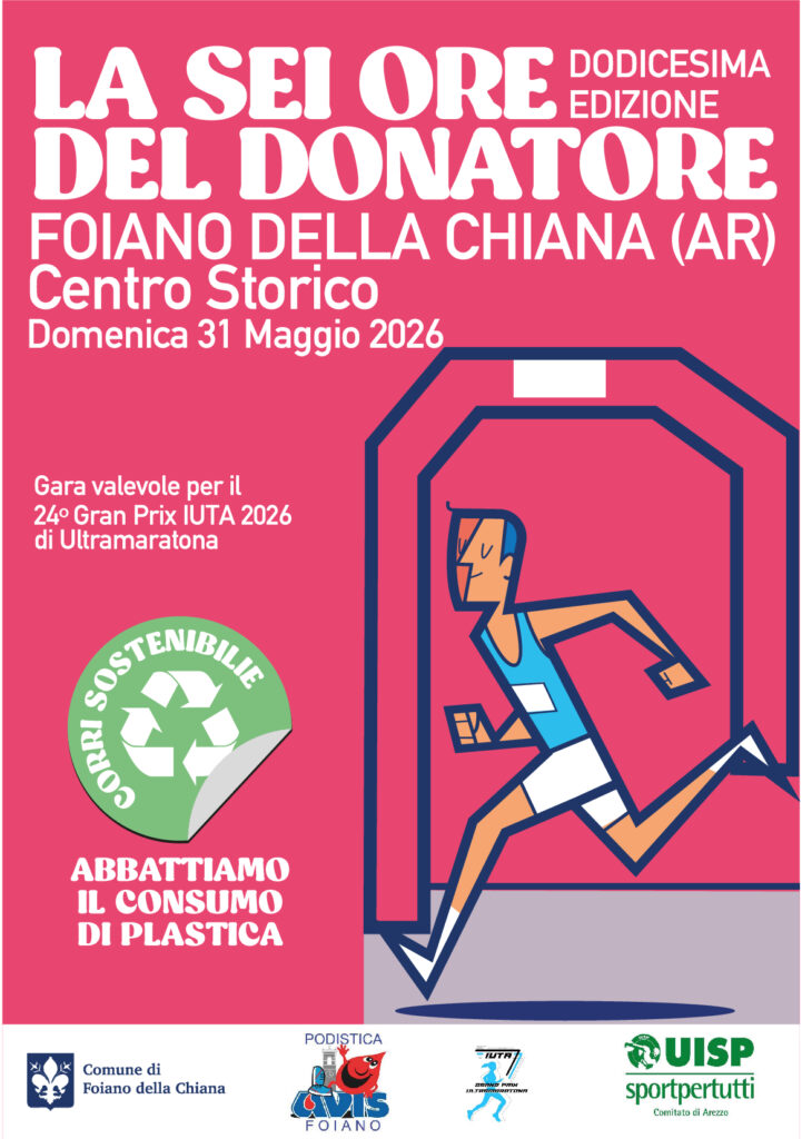12° 6 Ore del Donatore Data: 31/05/2026 Località: Foiano della Chiana (AR) 🏆 📌 Luogo: Toscana / Arezzo⏰ Orario: 10📏 Distanza (max): 42 km📍 Indirizzo: Piazza Matteotti - Foiano della Chiana📧 Email: info@podisticavisfoiano.it📞 Telefono: 3391575686Descrizione: 6 ore del Donatore Volantino / Regolamento