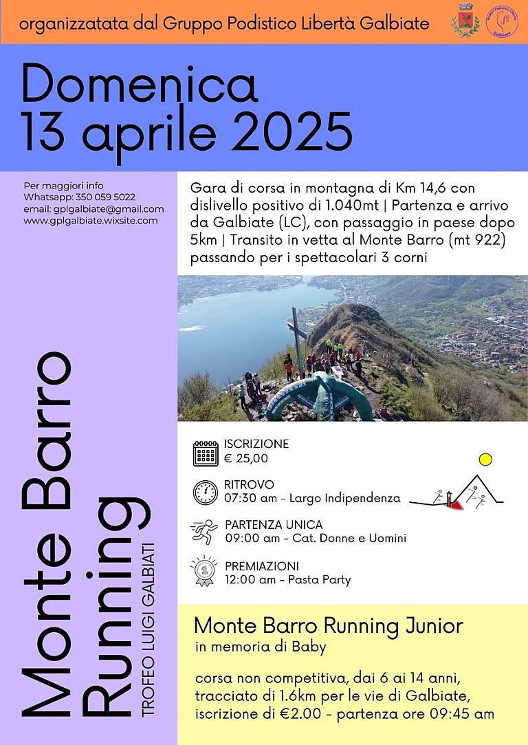12° Monte Barro Running Data: 13/04/2025 Località: Lecco (LC) 🏆 🏅 Classifica: Clicca qui 📌 Luogo: Lombardia / Lecco⏰ Orario: 09:00📍 Indirizzo: Oratorio di galbiate🔗 Sito: http://gplgalbiate.wixsite.com/monte-barro-running📧 Email: gplgalbiate@gmail.com📞 Telefono: 350.0595022 Volantino / Regolamento