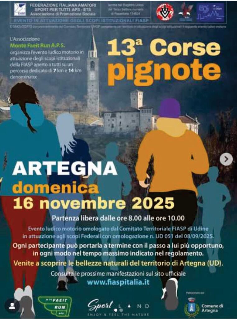 13° Corse Pignote Data: 16/11/2025 Località: Artegna (Ud) 📌 Luogo: Friuli-Venezia Giulia / Udine📏 Distanza (max): 14 km📧 Email: montefaeitrun@gmail.com📞 Telefono: 339.5816042 - 339.3138535Descrizione: Ludico motoria di Km 14 e Km 7. Partenza ore 08:00/10:00 c/o Piazza Marnico Volantino / Regolamento