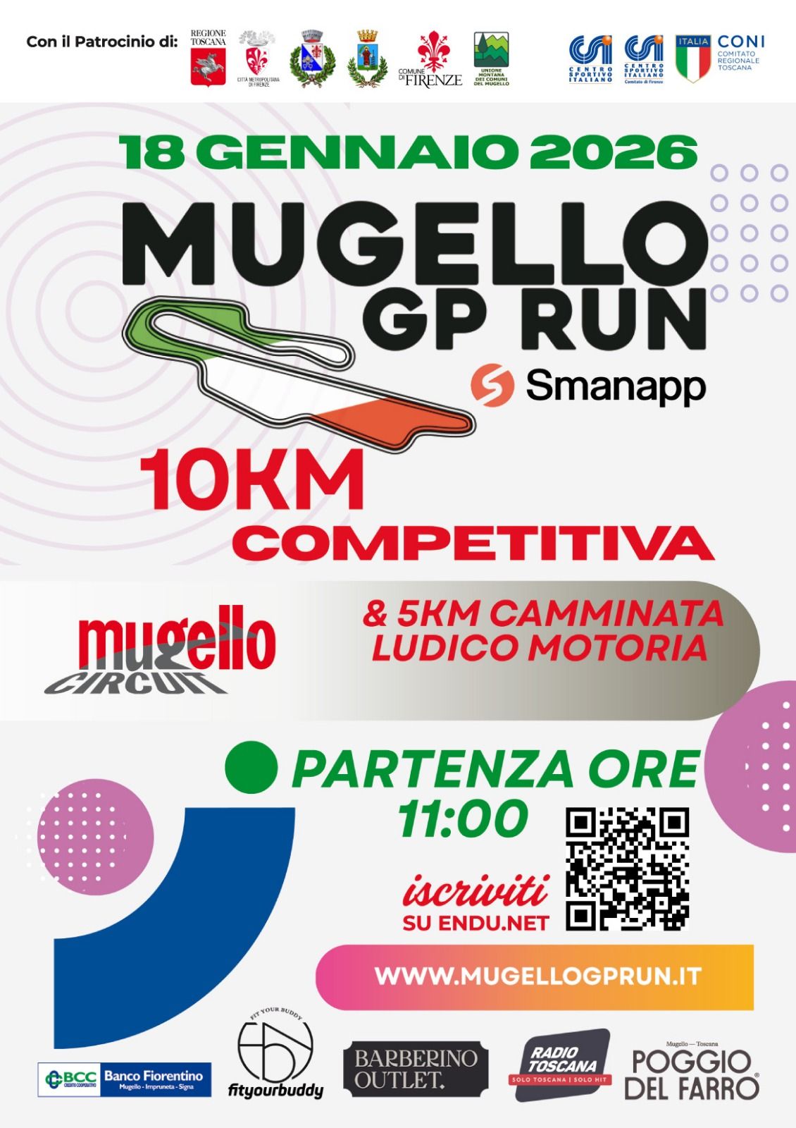 Descrizione: Competitiva di Km 10,490 (2 giri) e ludico motoria di Km 5 (1 giro). Partenza ore 11:00 c/o l'Autodromo del Mugello