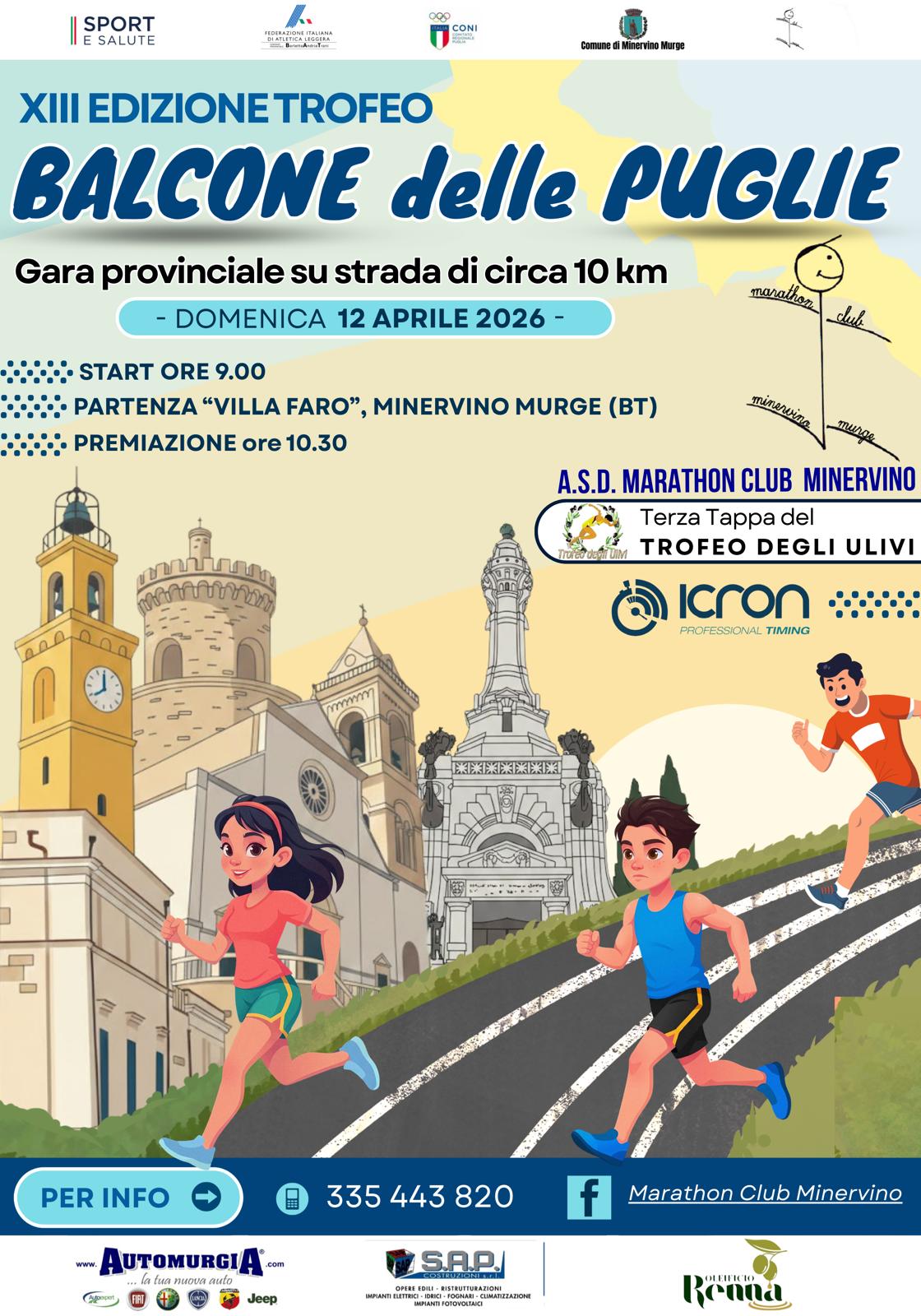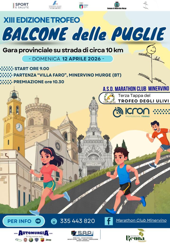 13° Trofeo balcone delle Puglie Data: 12/04/2026 Località: Minervino Murge (Bt) 🏆 📌 Luogo: Puglia / Barletta-Andria-Trani📏 Distanza (max): 10 km📍 Indirizzo: Minervino Murge, Barletta-Andria-Trani, Puglia, 76013, ItaliaDescrizione: Km 10 Tappa Trofeo degli Ulivi Volantino / Regolamento