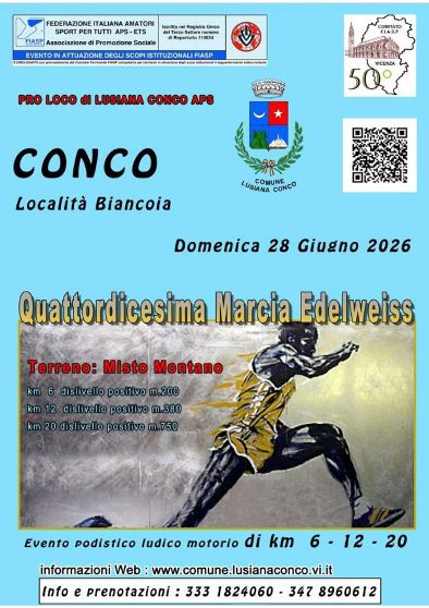 14° Marcia Edelweiss (20-12-6Km) Data: 28/06/2026 Località: Conco (Vi) 📌 Luogo: Veneto / Vicenza📏 Distanza (max): 20 km🔗 Sito: www.comune.lusianaconco.vi.it📞 Telefono: 333.1824060 - 338.1518129Descrizione: Ludico motoria di Km 20 - 12 - 6. Partenza ore 07:00/09:30 (Km 20 fino le ore 08:00) c/o il Rifugio Biancoia Volantino / Regolamento