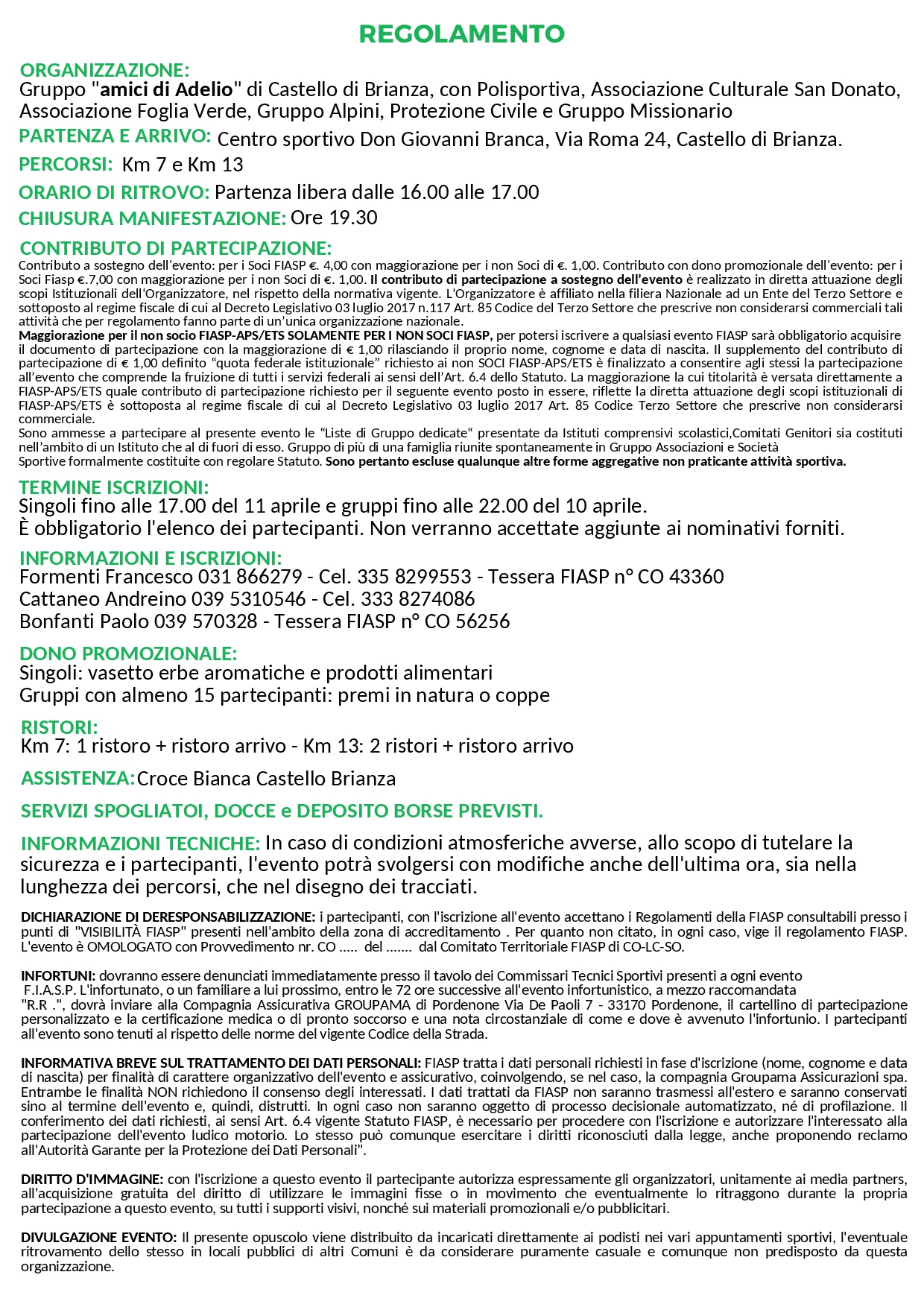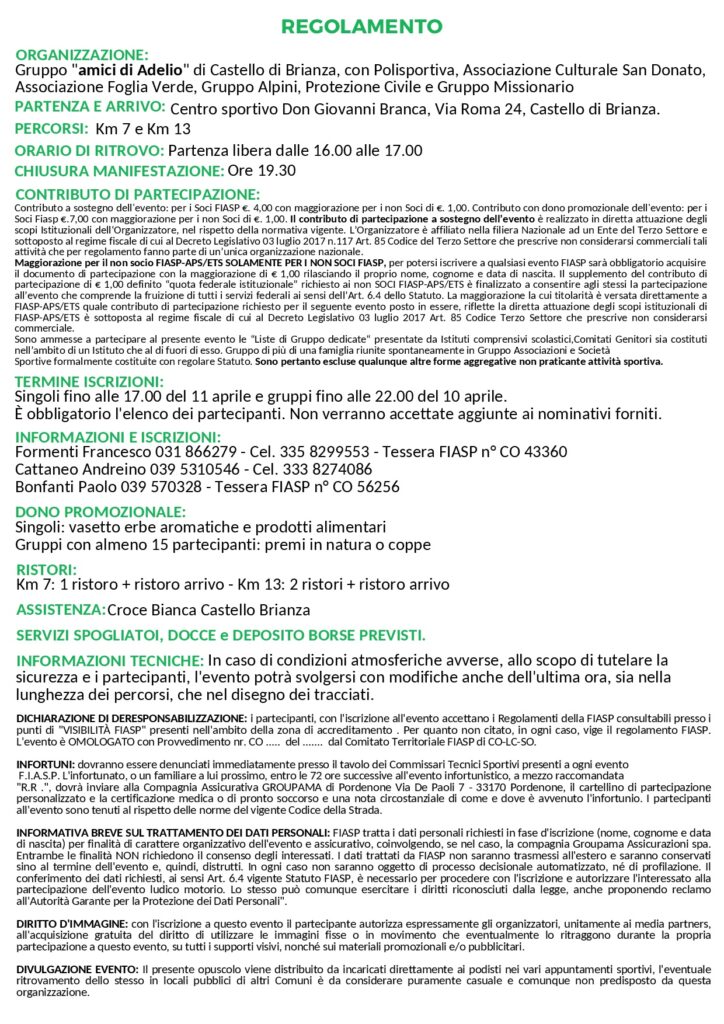 14° Marcia Per un Amico (13-7Km) Data: 11/04/2026 Località: Castello di Brianza (Lc) 📌 Luogo: Lombardia / Lecco📏 Distanza (max): 13 km📧 Email: polcastellobrianza@gmail.com - ilfranco60@libero.it📞 Telefono: 031.866279 - 335.8299553 - 039.5310546 - 333.8274086 - 039.570328Descrizione: Ludico motoria di Km 13 e Km 7. Partenza ore 16:00/17:00 da Via Roma 24 Volantino / Regolamento