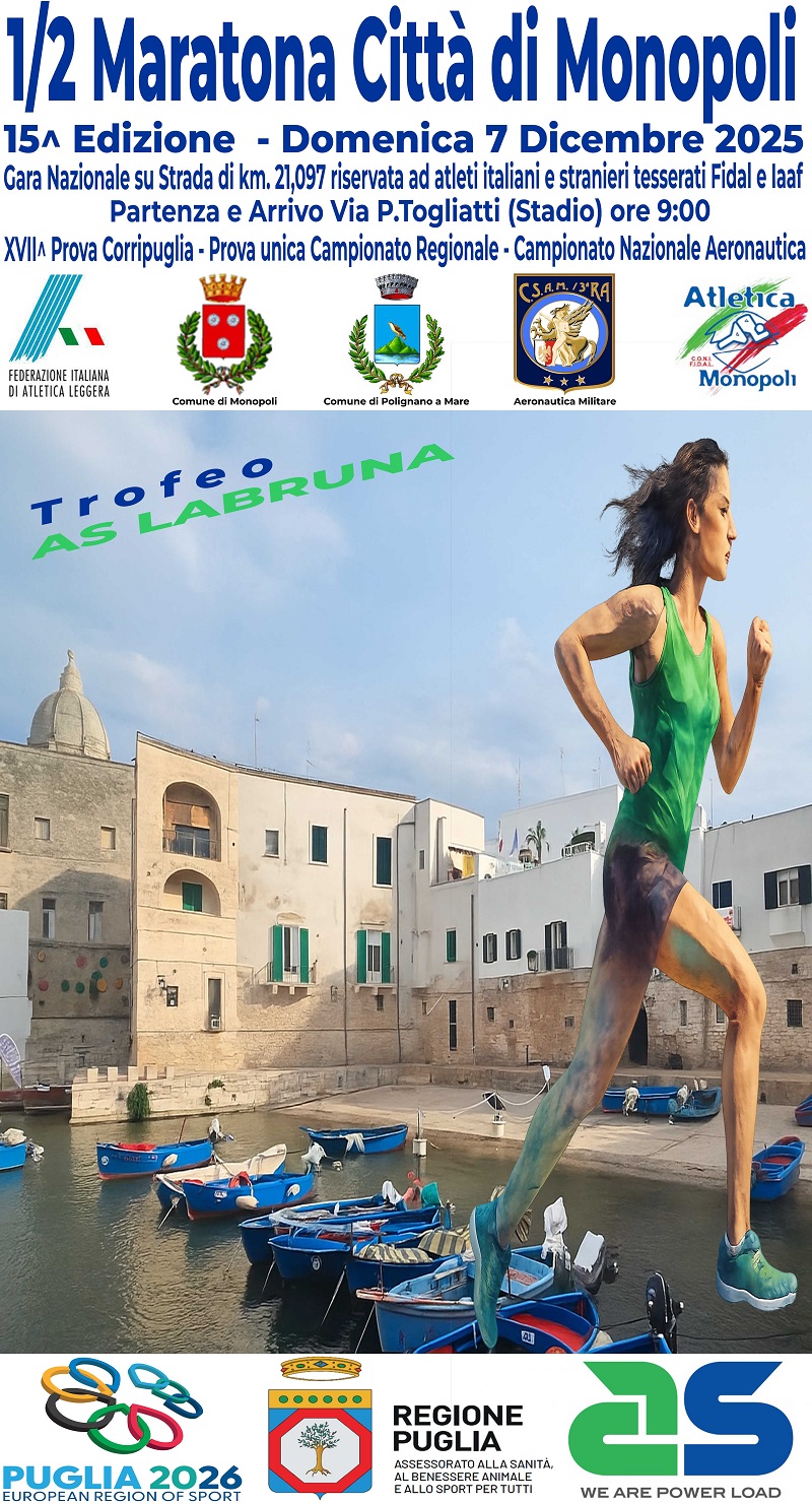 15° Mezza Maratona Citta’ di Monopoli Data: 07/12/2025 Località: Monopoli (Ba) 🏆 🏅 Classifica: Clicca qui 📌 Luogo: Puglia / Bari⏰ Orario: 09:00📏 Distanza (max): 21.097 kmDescrizione: Competitiva di Km 21,097. Partenza ore 09:00 da via Palmiro Togliatti (Stadio) Volantino / Regolamento