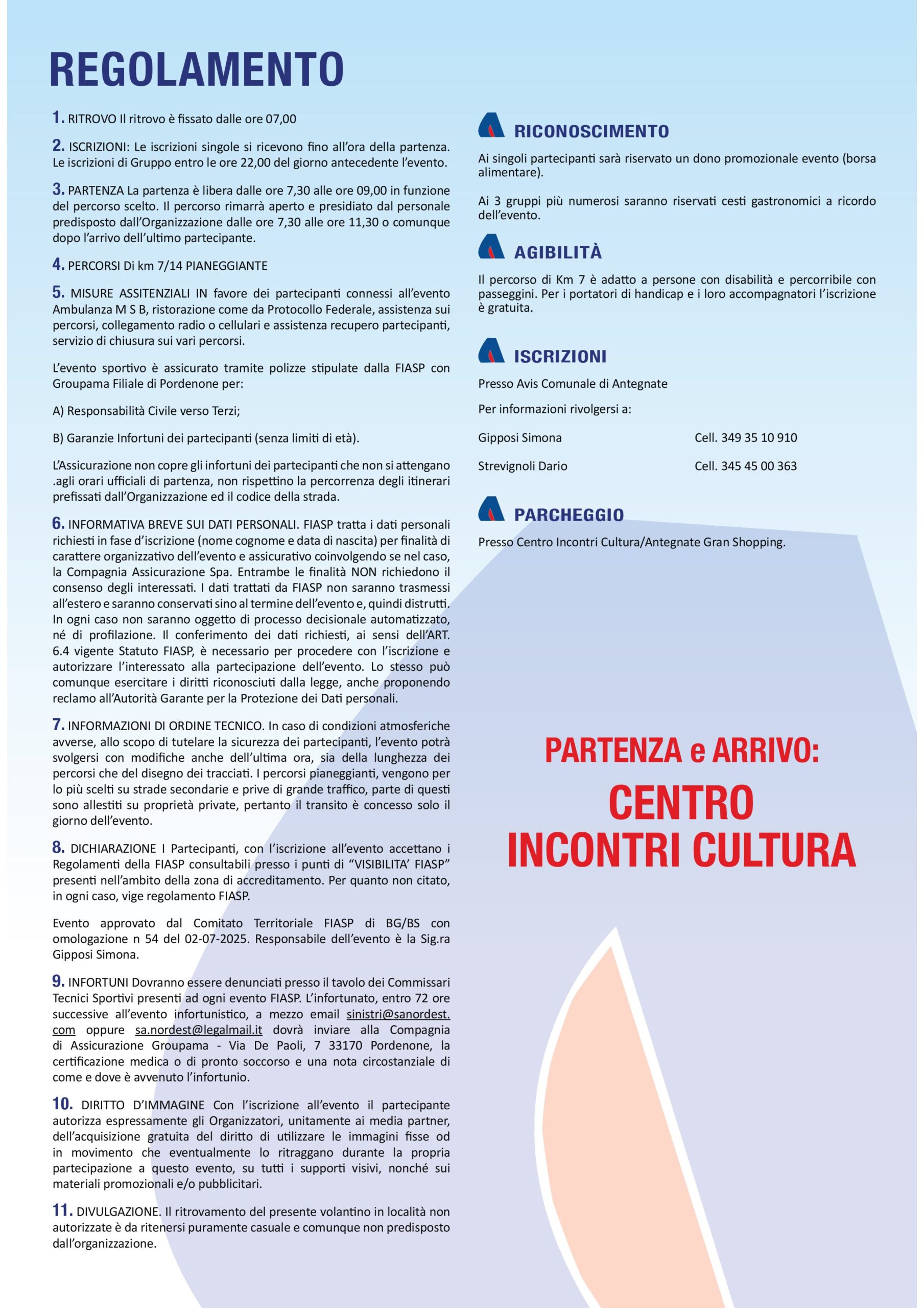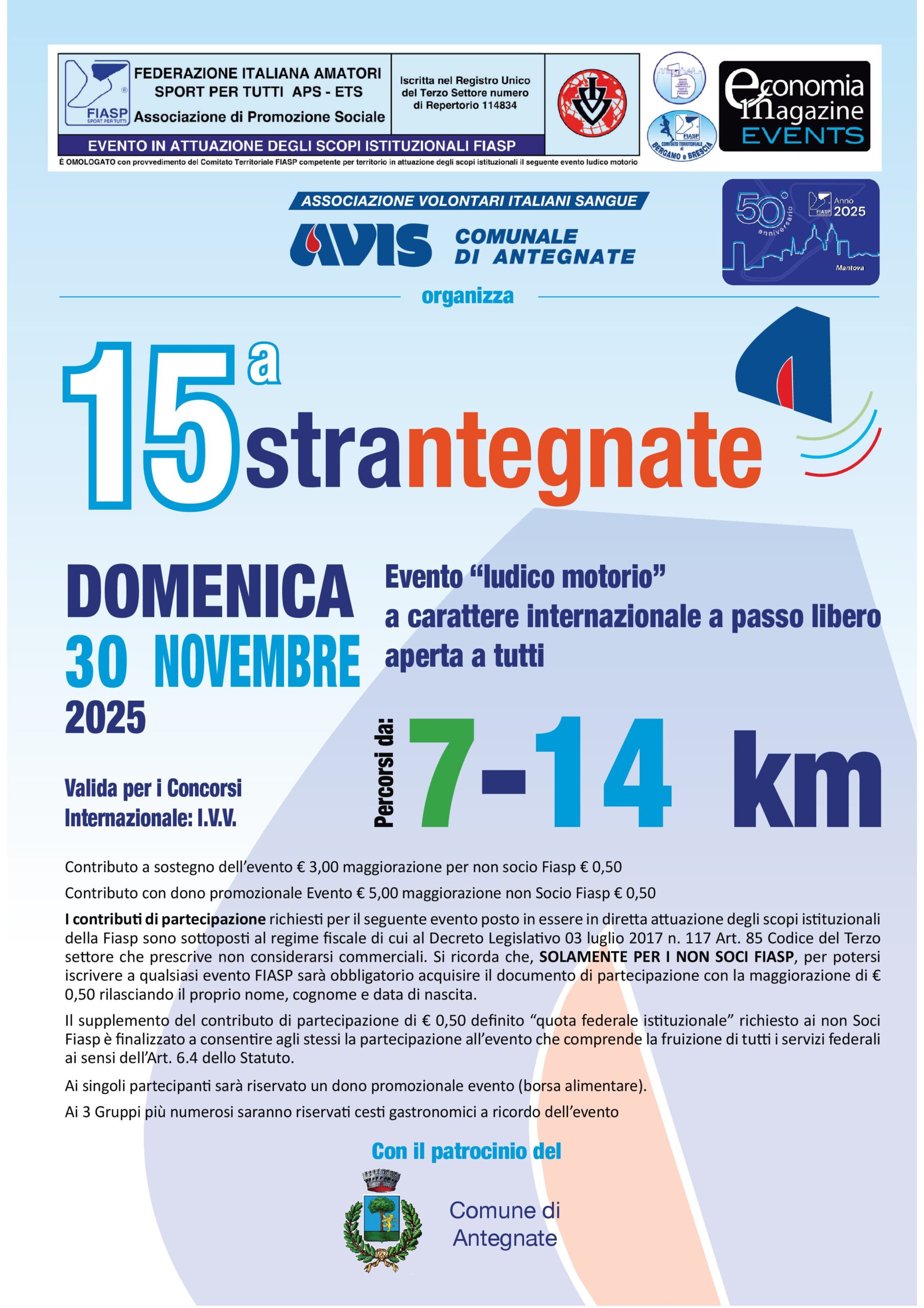 15° Strantegnate Data: 30/11/2025 Località: Antegnate (Bg) 📌 Luogo: Lombardia / Bergamo📏 Distanza (max): 14 km📞 Telefono: 349.3510910 - 345.4500363Descrizione: Ludico motoria di Km 14 e Km 7. Partenza ore 07:30/09:00 c/o il Centro Incontri Cultura Volantino / Regolamento