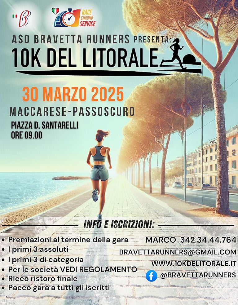 2° 10 Km del Litorale – Passoscuro Fiumicino Data: 30/03/2025 Località: Roma (RM) 🏆 🏅 Classifica: Clicca qui 📌 Luogo: Lazio / Roma⏰ Orario: 09:00📍 Indirizzo: fiumicinoDescrizione: Competitiva e non di Km 10 Volantino / Regolamento