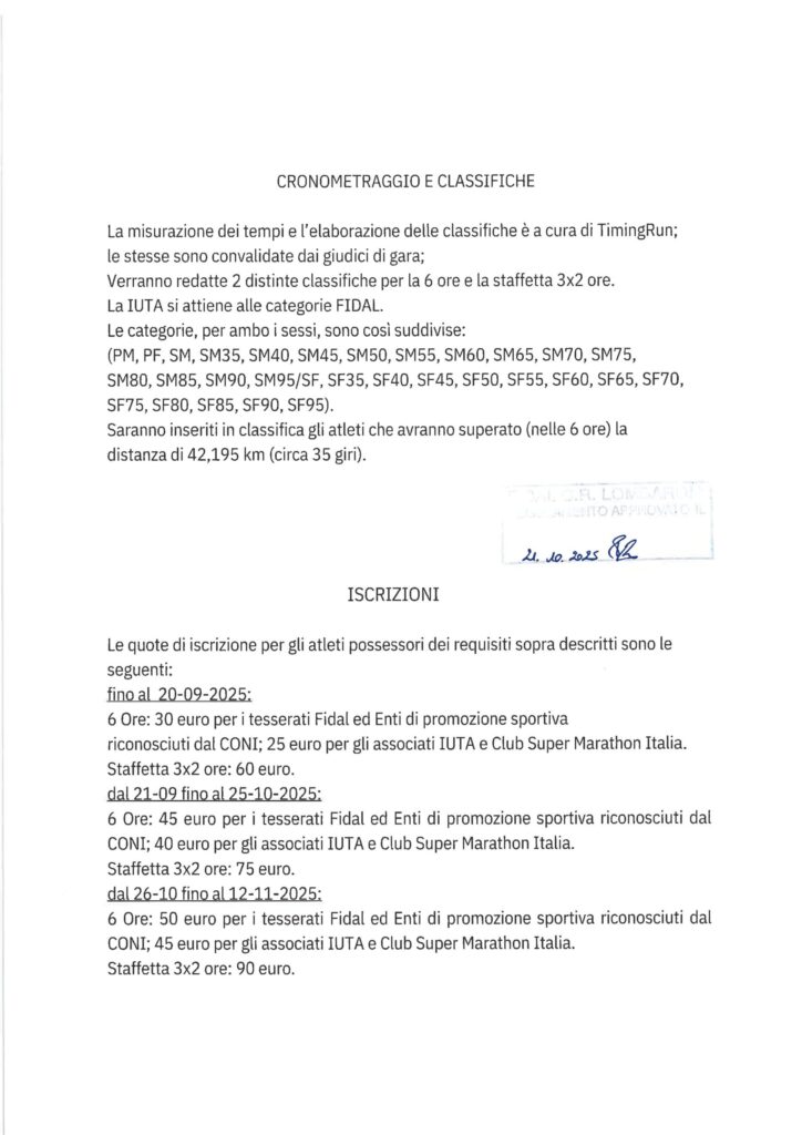 Descrizione: Competitiva individuale di 6 ore o staffetta di 3 atleti per 2 ore c/u su percorso di Km 1,2. Partenza ore 09:00 c/o il Parco Oasi Sportiva, via Cavalieri di Vittorio Veneto 236