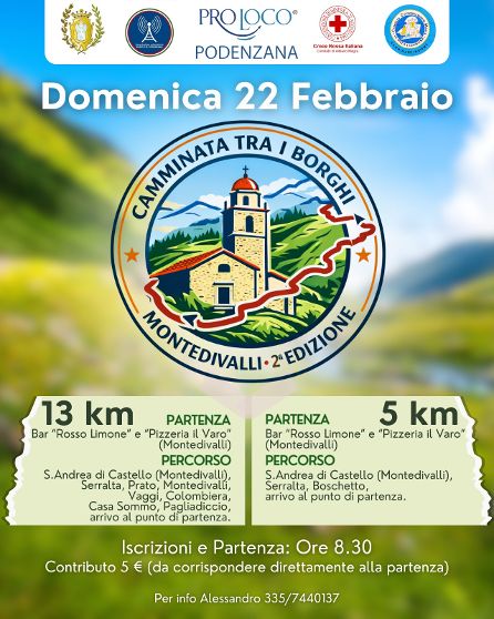 2° Camminata tra i borghi di Montedivalli Data: 22/02/2026 Località: Podenzana (Ms) 📌 Luogo: Toscana / Massa-Carrara📏 Distanza (max): 13 km📞 Telefono: 335.7440137Descrizione: Ludico motoria di Km 13 e Km 5. Partenza ore 08:30/09:00 c/o la Pieve Sant'andrea di Castello Volantino / Regolamento