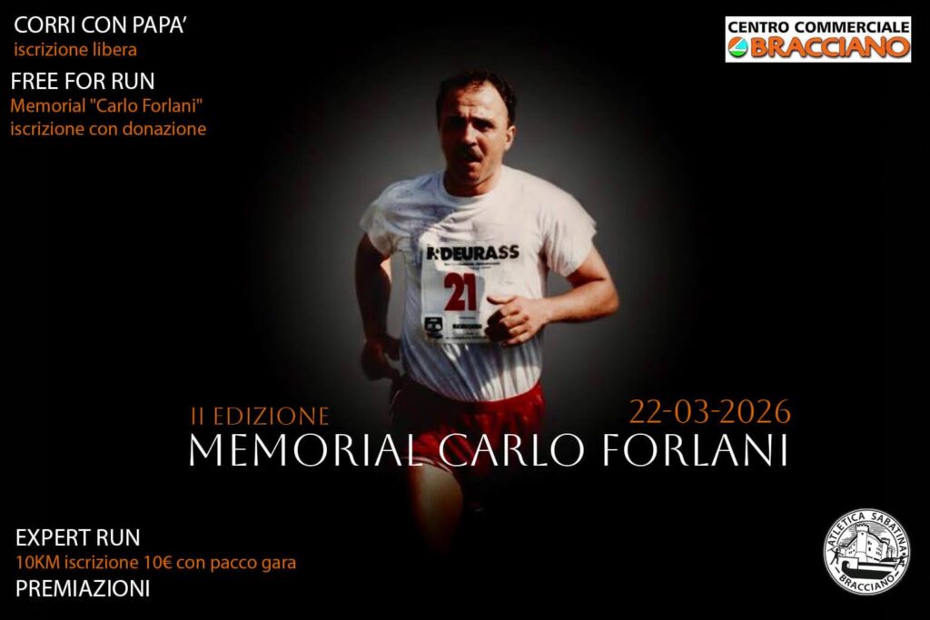 2° Memorial Carlo Forlani Data: 22/03/2026 Località: Bracciano (Rm) 🏆 📌 Luogo: Lazio / Roma⏰ Orario: 10📏 Distanza (max): 10.200 km📍 Indirizzo: Via Sandro Pertini c/o Centro Commerciale BraccianoDescrizione: Km 10,2 Volantino / Regolamento