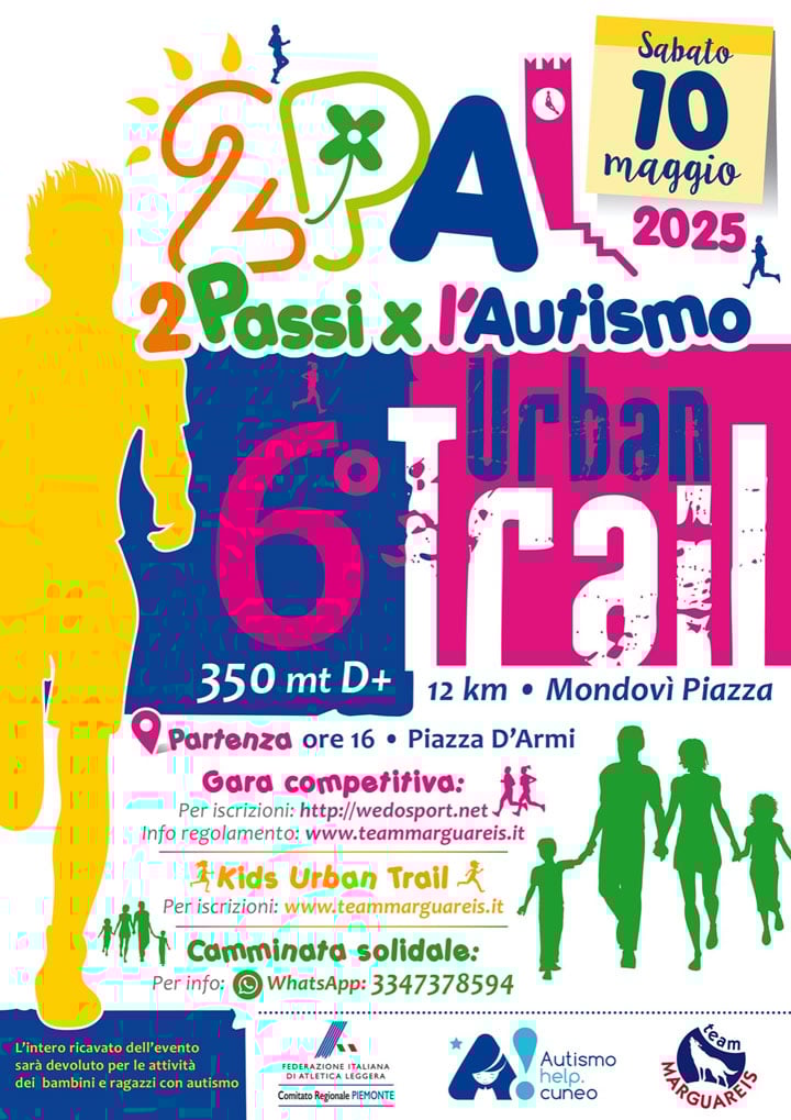 trail cittadino competitivo su circuito di 4km da ripetere 3 volte con 500 metri di dislivello e camminata solidale aperta a tutti. Il ricavato sarà devoluto INTERAMENTE all’associazione ONLUS AUTISMO HELP CUNEO.