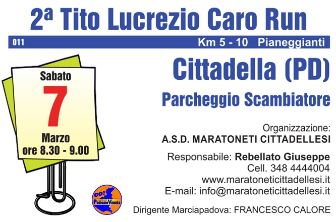 2° Tito Lucrezio Caro Run Data: 07/03/2026 Località: Cittadella (Pd) 📌 Luogo: Veneto / Padova📏 Distanza (max): 10 km🔗 Sito: www.maratoneticittadellesi.it📧 Email: info@maratoneticittadellesi.it📞 Telefono: 348.4444004Descrizione: Ludico motoria di Km 10 e Km 5. Partenza ore 09:00 c/o Liceo Tito Lucrezio Caro, via Gabrielli Pianeggianti Volantino / Regolamento
