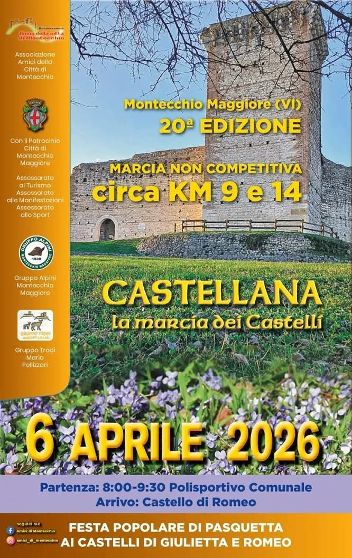 20° Castellana – La Marcia dei Castelli (14-9Km) Data: 06/04/2026 Località: Montecchio Maggiore (Vi) 📌 Luogo: Veneto / Vicenza📏 Distanza (max): 13 km📞 Telefono: Non pervenutoDescrizione: Non competitiva di Km 14 e Km 9. Partenza ore 08:00/09:30 c/o il Polisportivo Comunale Volantino / Regolamento