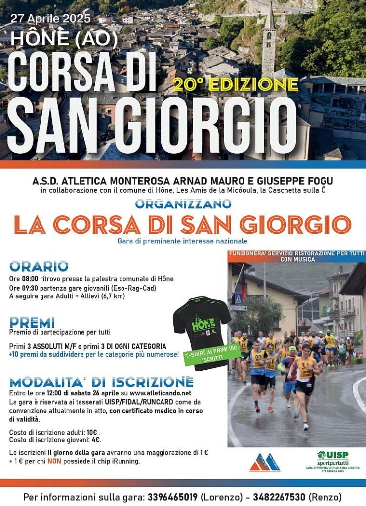 20° Corsa Podistica di San Giorgio Data: 27/04/2025 Località: Aosta (AO) 🏆 🏅 Classifica: Clicca qui 📌 Luogo: Valle d'Aosta / Aosta⏰ Orario: 09:30📍 Indirizzo: Palestra Comunale Hone📞 Telefono: 339.6465019 Volantino / Regolamento