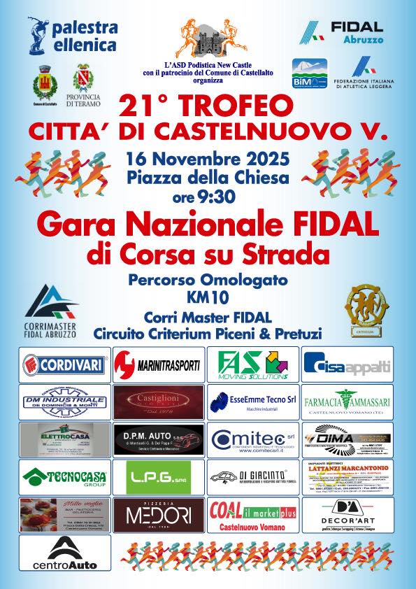 21° Trofeo Città di Castelnuovo Vomano Data: 16/11/2025 Località: Castelnuovo Vomano (Te) 🏆 🏅 Classifica: Clicca qui 📌 Luogo: Abruzzo / Teramo⏰ Orario: 09:30📧 Email: podisticanewcastle@gmail.comDescrizione: Competitiva di Km 10. Partenza ore 09:30 dalla Piazza della Chiesa Volantino / Regolamento