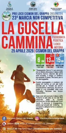 23° La Gusella Cammina Data: 25/04/2026 Località: Cismon del Grappa (Bl) 📌 Luogo: Veneto / Vicenza📏 Distanza (max): 15 km📧 Email: prolococismon@libero.it📞 Telefono: 333.3121704Descrizione: Ludico motoria di Km 15 - Km 13 - Km 5. Partenza ore 07:30/9,00 Volantino / Regolamento