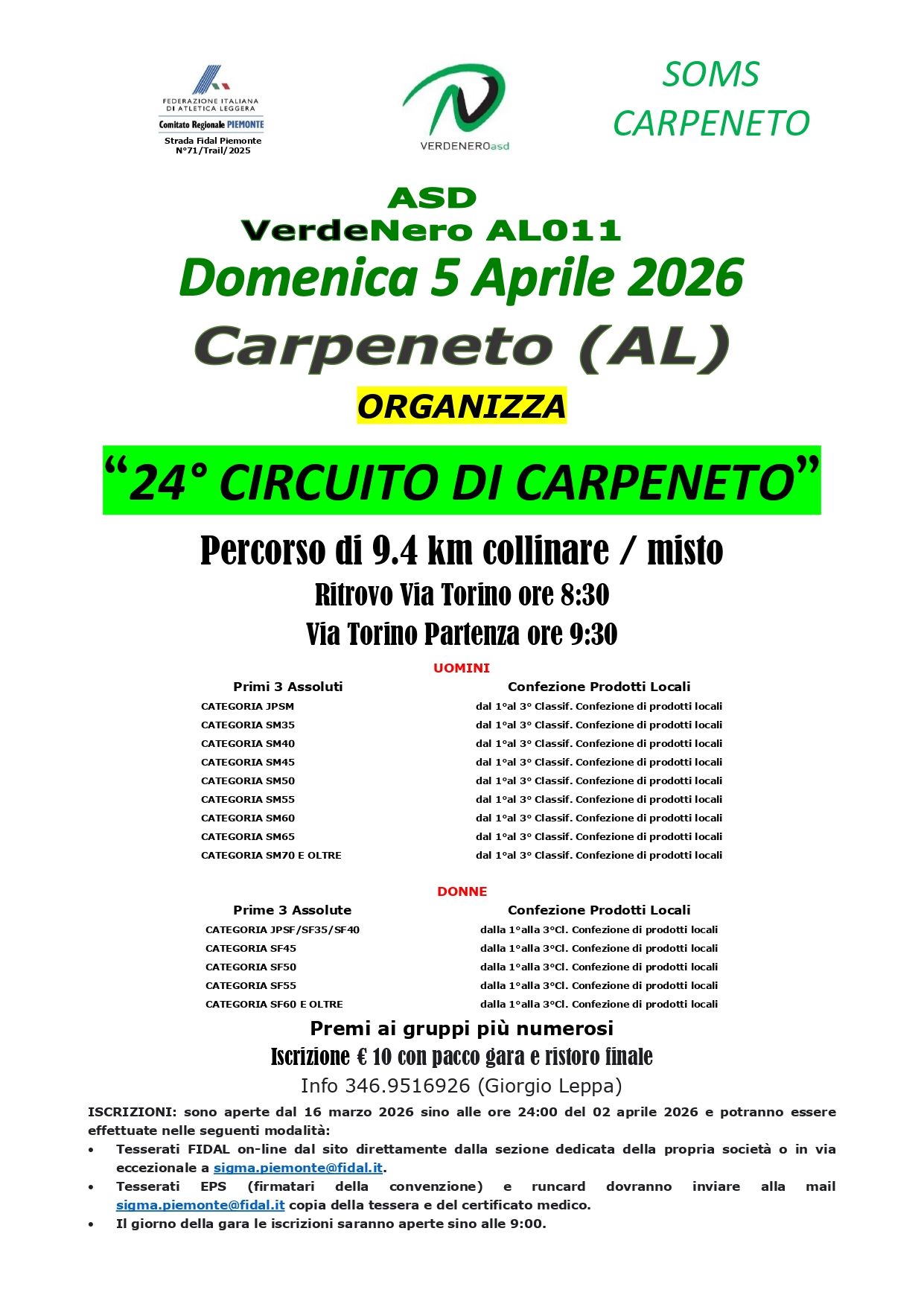 24° Circuito di Carpeneto Data: 05/04/2026 Località: Carpeneto (AL) 🏆 📌 Luogo: Piemonte / Alessandria⏰ Orario: 9,30📏 Distanza (max): 9.4 km📍 Indirizzo: Carpeneto, Alessandria, Piemonte, 15071, ItaliaDescrizione: Km 9,4 percorso collinare Volantino / Regolamento