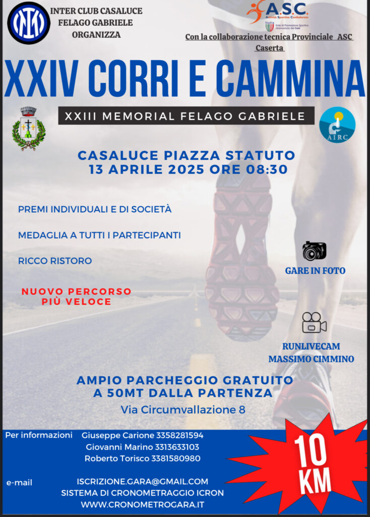 24^ Corri e Cammina Data: 13/04/2025 Località: Caserta (CE) 🏆 🏅 Classifica: Clicca qui 📌 Luogo: Campania / Caserta⏰ Orario: 08:30📍 Indirizzo: Piazza dello statuto casaluce Volantino / Regolamento