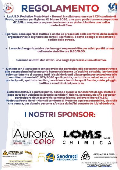 Descrizione: Non competitiva di Km 13,5 e ludico motoria di Km 6 Partenza ore 09:00 c/o Circolo Renzo Grassi, via Pistoiese 502, Narnali