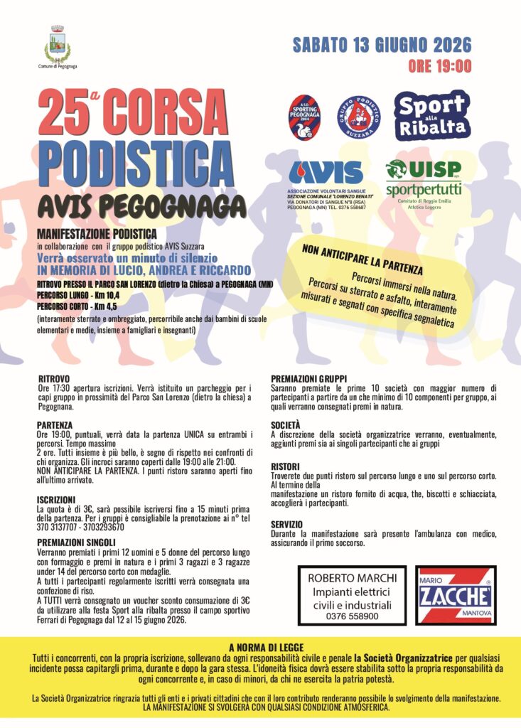 25° Corsa Podistica Avis Pegognaga (10,4-4,5Km) Data: 13/06/2026 Località: Pegognaga (Mn) 📌 Luogo: Lombardia / Mantova📏 Distanza (max): 10.4 km📞 Telefono: 370.3137707Descrizione: Non competitiva di Km 10,4 e Km 4,5. Partenza ore 19:00 c/o Parco San Lorenzo (dietro la Chiesa) Volantino / Regolamento