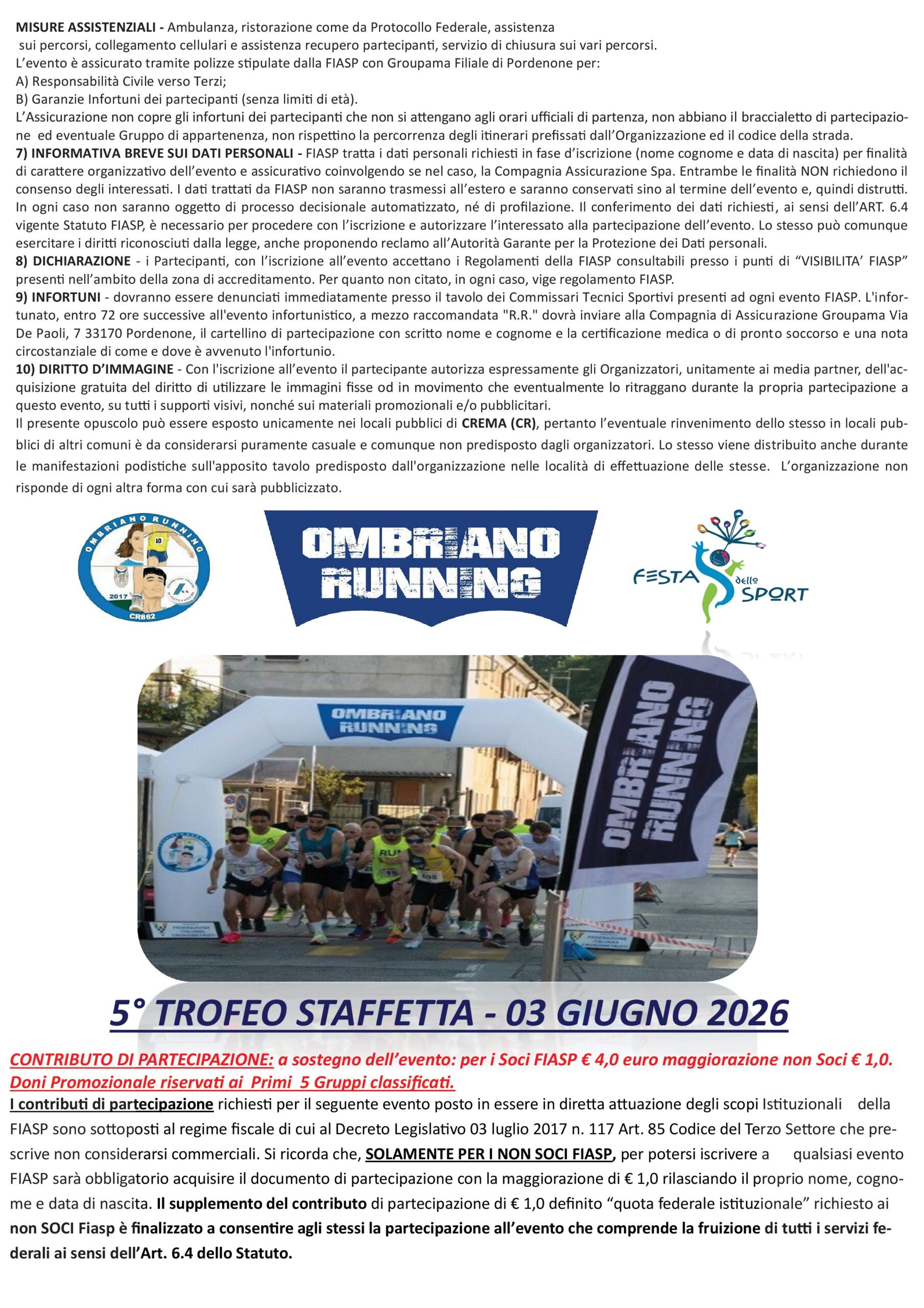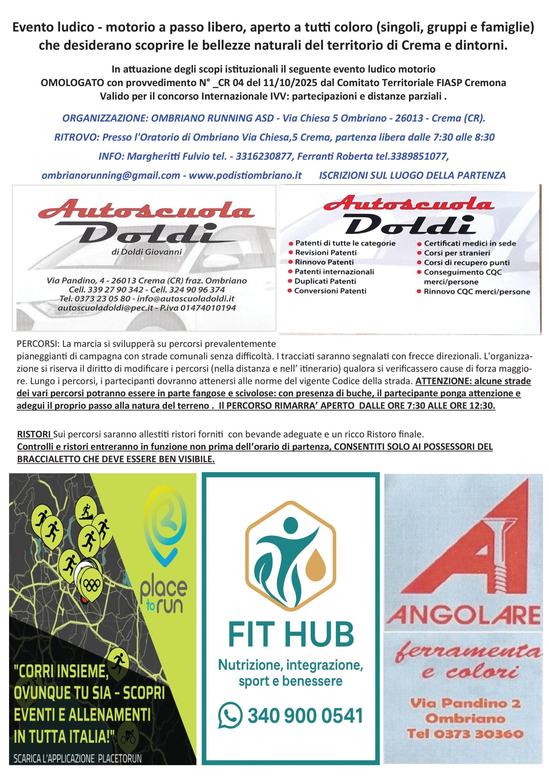 Descrizione: Ludico motoria di Km 21 - 15 - 11 - 8. Partenza ore 07:30/08:30 c/o Oratorio di Ombriano, via Chiesa 5