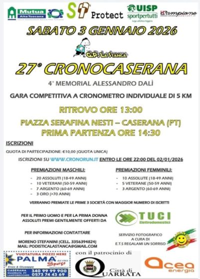 Descrizione: Competitiva a cronometro individuale di Km 5. Prima partenza ore 14:30 c/o Piazza Serafina Nesti