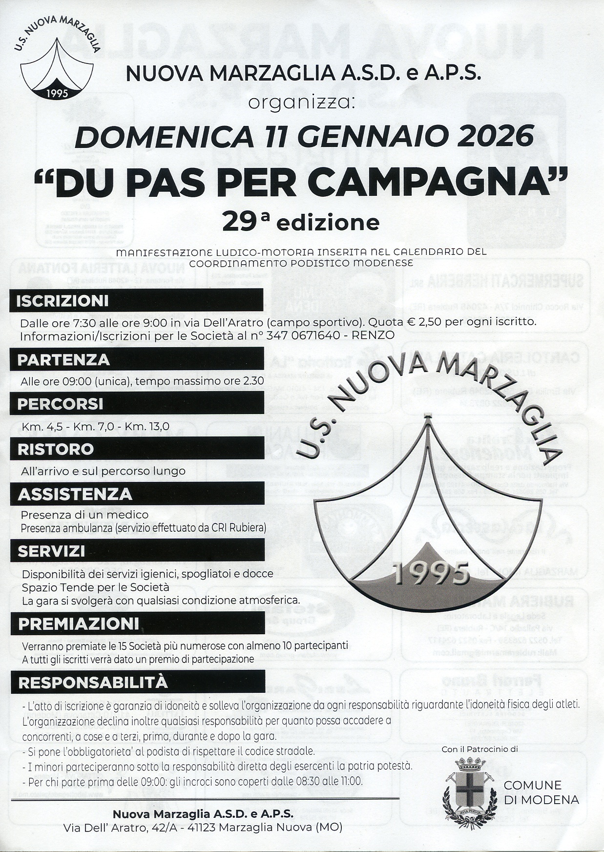 29° Du Pas Per Campagna Data: 11/01/2026 Località: Marzaglia Nuova (MO) 📌 Luogo: Emilia-Romagna / Modena⏰ Orario: 9,00📏 Distanza (max): 13 km📍 Indirizzo: Marzaglia Nuova, Modena, Emilia-Romagna, 41048, Italia📞 Telefono: Franco Ferrari 335 335986Descrizione: Km 4,5 - Km 7 - Km 13 Volantino / Regolamento