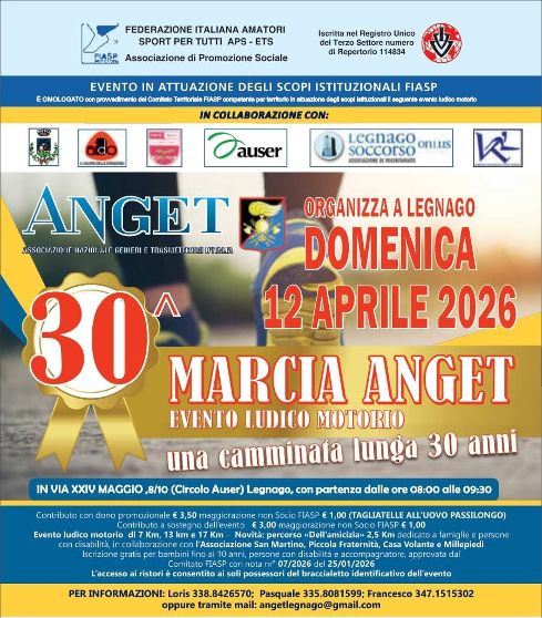29° Marcia Anget Data: 12/04/2026 Località: Legnago (Vr) 📌 Luogo: Veneto / Verona📏 Distanza (max): 17 km📧 Email: angetlegnago@gmail.com📞 Telefono: 335.8081599 - 338.8426570 - 347.1515302Descrizione: Km 17 - 13 - 7 - 2,5 Volantino / Regolamento