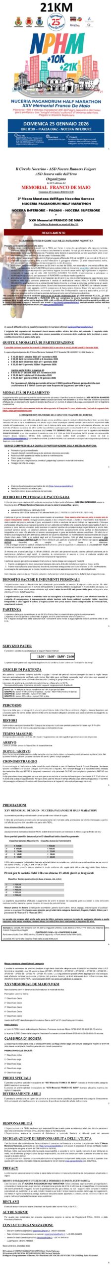 3° Nuceria Paganorum Half Marathon – XXV Memorial Franco De Maio Data: 25/01/2026 Località: Nocera Inferiore (Sa) 🏆 📌 Luogo: Campania / Salerno⏰ Orario: 8,30📏 Distanza (max): 21.0975 km📍 Indirizzo: Piazza Diaz Nocera Inferiore (Sa)📧 Email: iscrizioni@garepodistiche.itDescrizione: Km. 9,9 - Km 21,975 Volantino / Regolamento Apri