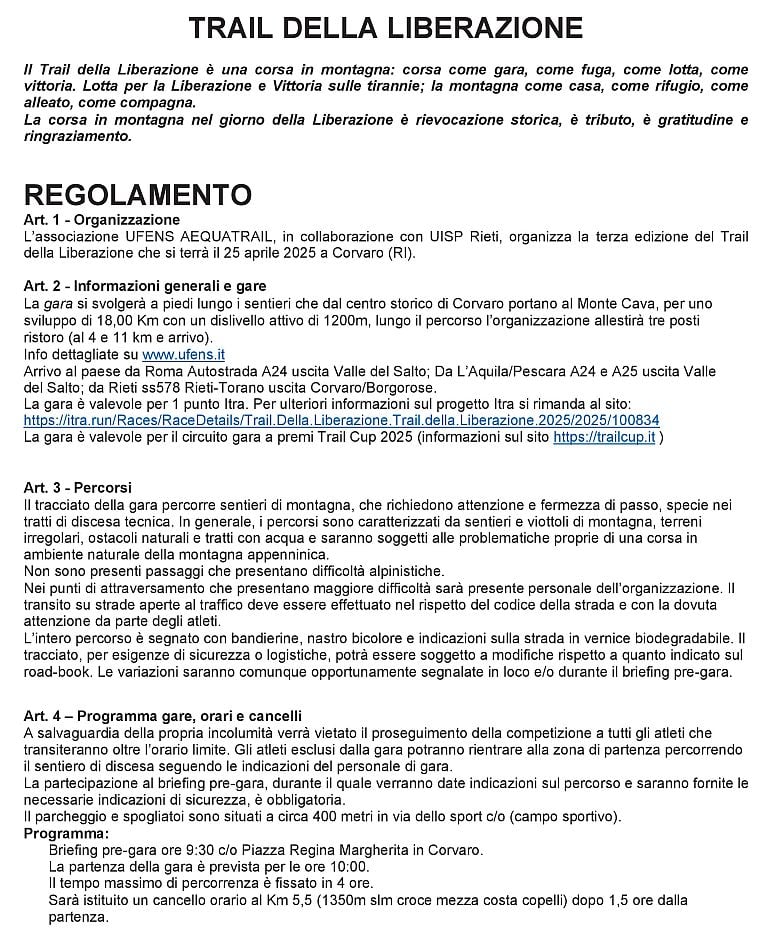 3° Trail della Liberazione Data: 25/04/2025 Località: Rieti (RI) 🏆 🏅 Classifica: Clicca qui 📌 Luogo: Lazio / Rieti⏰ Orario: 10:00📍 Indirizzo: piazza regina margherita corvaro🔗 Sito: http://www.ufens.it/📧 Email: info@ufens.it Volantino / Regolamento
