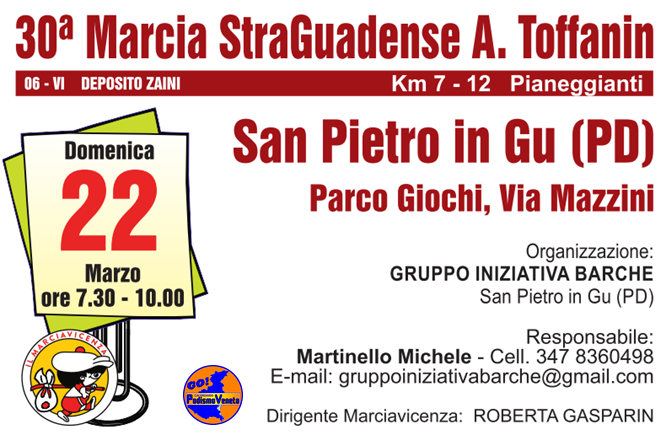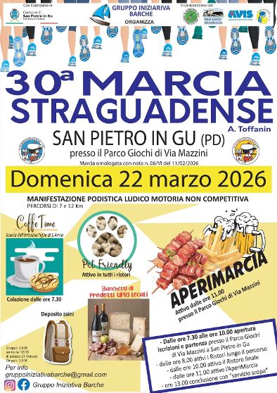 30° Marcia Straguadense Data: 22/03/2026 Località: San Pietro in Gù (Pd) 📌 Luogo: Veneto / Padova📏 Distanza (max): 12 km📧 Email: gruppoiniziativabarche@gmail.com📞 Telefono: 347.8360498Descrizione: Ludico motoria di Km 12 e Km 7. Partenza ore 07:30/09:00 c/o il parco giochi di via Giuseppe Mazzini Volantino / Regolamento