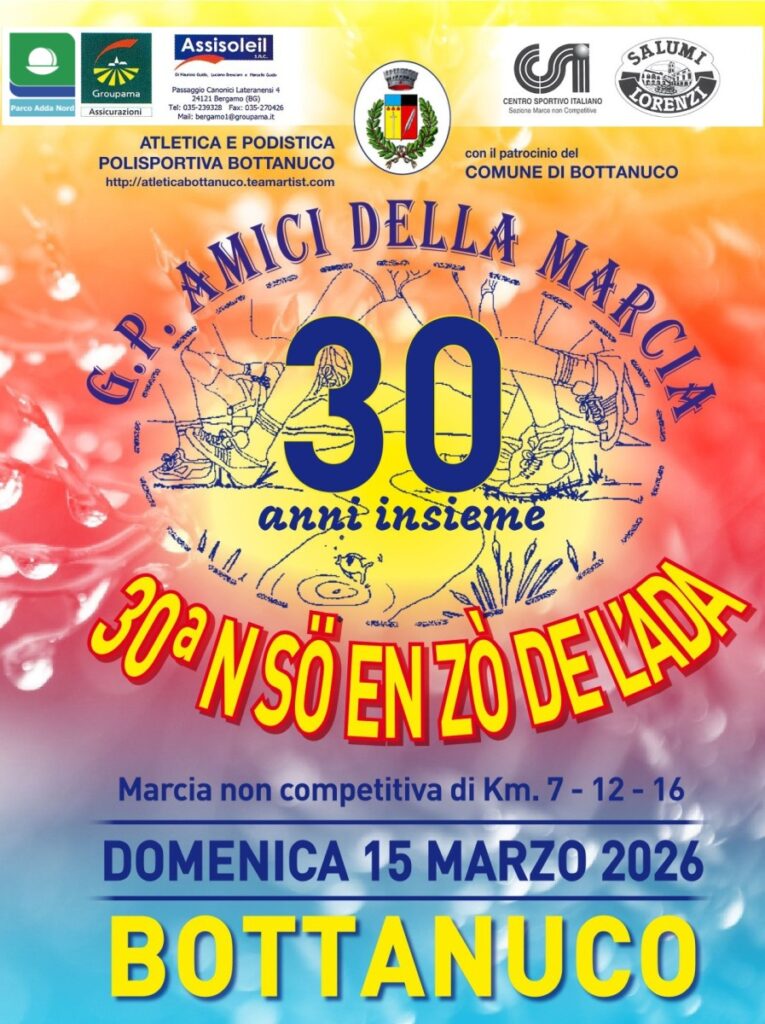 30° N’So En’Zo De L’ Ada 2026 Data: 15/03/2026 Località: Bottanuco (Bg) 📌 Luogo: Lombardia / Bergamo⏰ Orario: 7.30📏 Distanza (max): 16 km📍 Indirizzo: Via John Fitzgerald Kennedy, Bottanuco, Bergamo, Lombardia, 24040, ItaliaDescrizione: Corsa/Camminata non competitiva