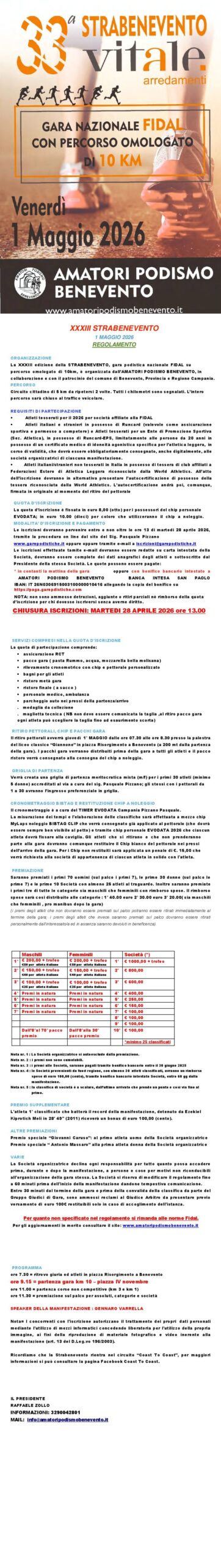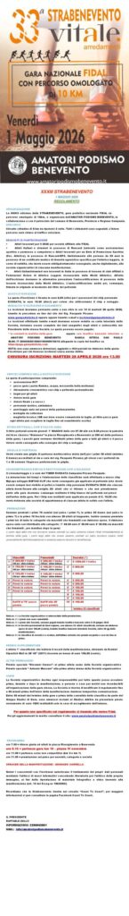 33° StraBenevento Data: 01/05/2026 Località: Benevento (Bn) 🏆 📌 Luogo: Campania / Benevento📏 Distanza (max): 10 km🔗 Sito: www.amatoripodismobenevento.it📧 Email: info@amatoripodismobenevento.it📞 Telefono: 329.0042801Descrizione: Competitiva di Km 10 (due giri da 5 km) Partenza ore 09:15 da Piazza IV Novembre Volantino / Regolamento