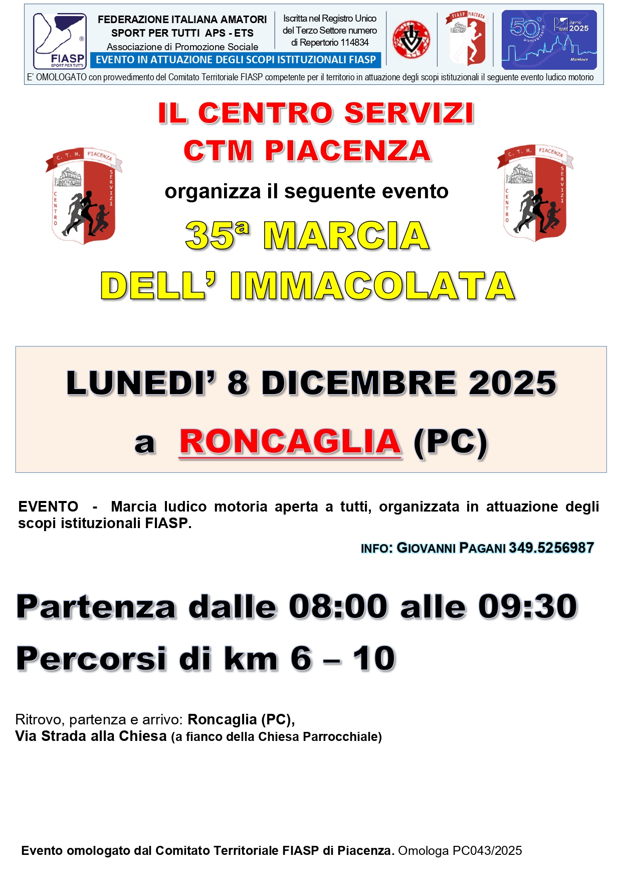 35° Marcia dell’Immacolata Data: 08/12/2025 Località: Roncaglia - Piacenza (Pc) 📌 Luogo: Emilia-Romagna / Piacenza📏 Distanza (max): 10 km📞 Telefono: 349.5256987Descrizione: Ludico motoria di Km 10 e Km 6. Partenza ore 08:00/09:30 da Strada alla Chiesa 23 Volantino / Regolamento