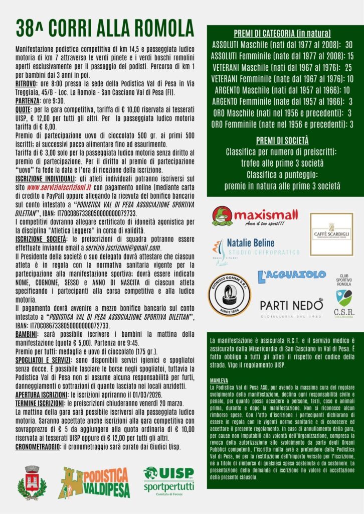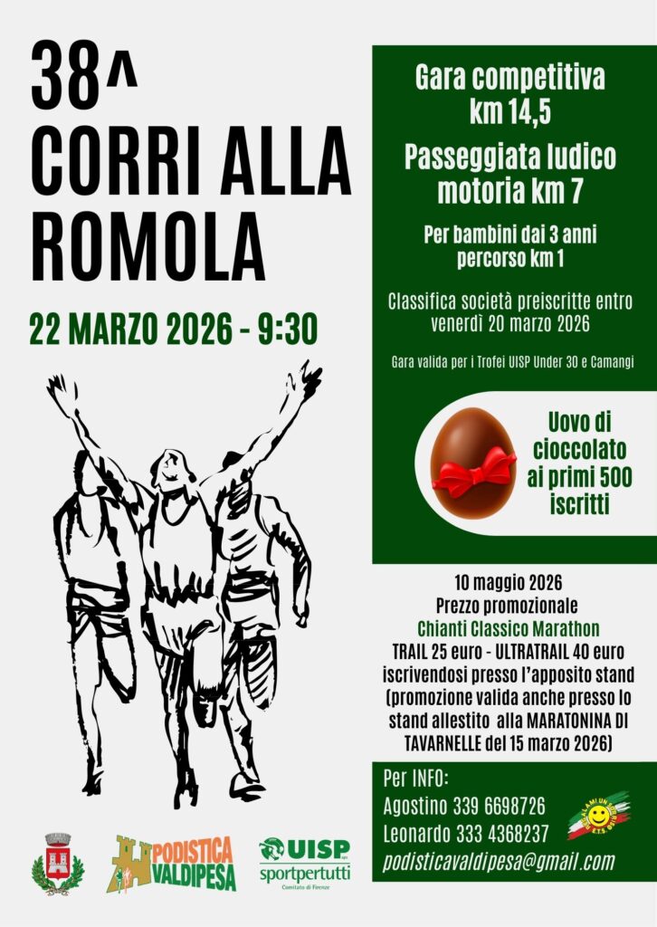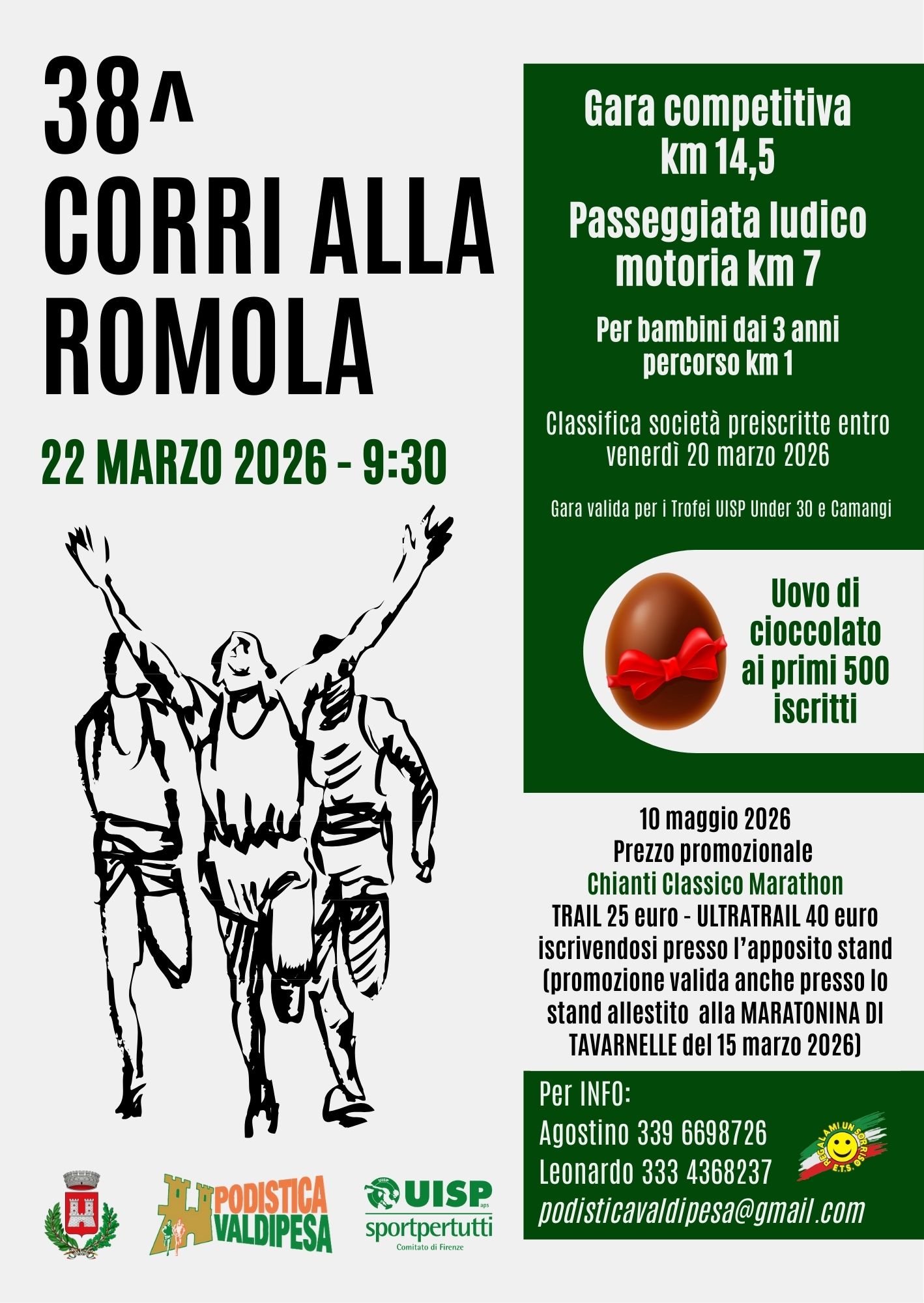38° Corri alla Romola Data: 22/03/2026 Località: La Romola - San Casciano in Val di Pesa (Fi) 🏆 📌 Luogo: Toscana / Firenze⏰ Orario: 9:30📏 Distanza (max): 14.5 km📍 Indirizzo: 45b, Via Treggiaia, La Romola, Mulino di Sugana, La Romola, San Casciano in Val di Pesa, Firenze, Toscana, 50026, Italia Volantino / Regolamento