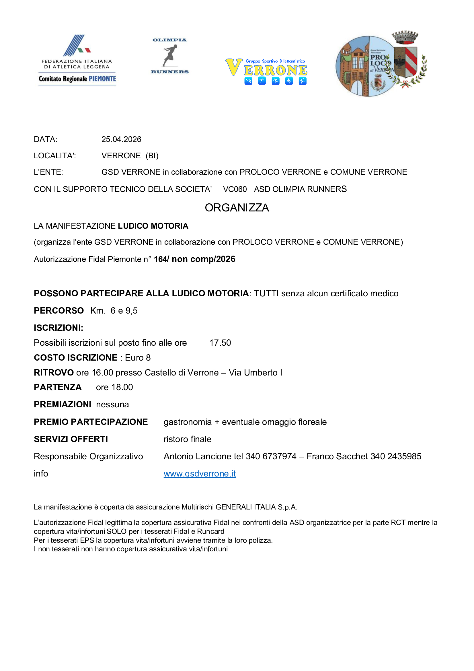 4° Camminata tra Castello e Cascine (9,5-6Km) Data: 25/04/2026 Località: Verrone (Bi) 📌 Luogo: Piemonte / Biella📏 Distanza (max): 9.5 km📞 Telefono: 340.6737974Descrizione: Non competitiva di Km 9,5 e Km 6. Partenza ore 18:00 c/o la corte del Castello di Verrone Volantino / Regolamento