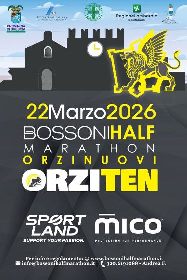 4° OrziTen by Gruppo Bossoni Data: 22/03/2026 Località: Orzinuovi (Bs) 🏆 📌 Luogo: Lombardia / Brescia⏰ Orario: 9📏 Distanza (max): 21.0975 km📍 Indirizzo: Orzinuovi, Unione dei Comuni Bassa Bresciana Occidentale, Brescia, Lombardia, 25034, Italia🔗 Sito: http://www.bossonihalfmarathon.it/Descrizione: Km 10 - Km 21,0975 Volantino / Regolamento