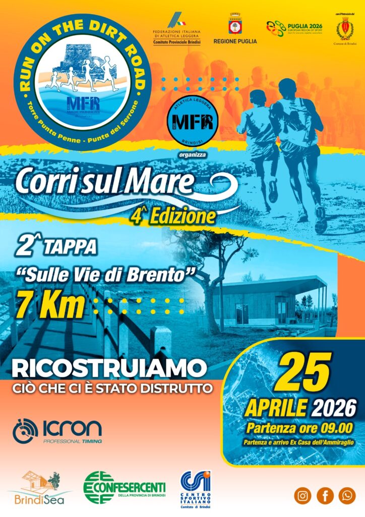 4° Run on The Dirt Road-Corri sul Mare Data: 25/04/2026 Località: Punta Penna (Br) 🏆 📌 Luogo: Puglia / Brindisi⏰ Orario: 9,30📏 Distanza (max): 7 km📍 Indirizzo: Punta Penna (Br)Descrizione: Km 7 Volantino / Regolamento