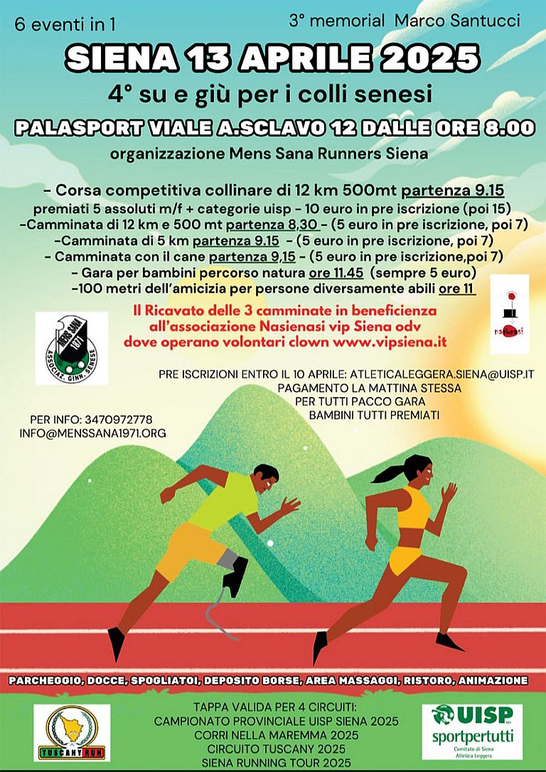 4° Su e giù per I Colli Senesi Data: 13/04/2025 Località: Siena (SI) 🏅 Classifica: Clicca qui 📌 Luogo: Toscana / Siena⏰ Orario: 09:15📍 Indirizzo: Palasport Mens Sana, via Achille Sclavo 12📧 Email: atleticaleggera.siena@uisp.it📞 Telefono: 347.0972778 Volantino / Regolamento
