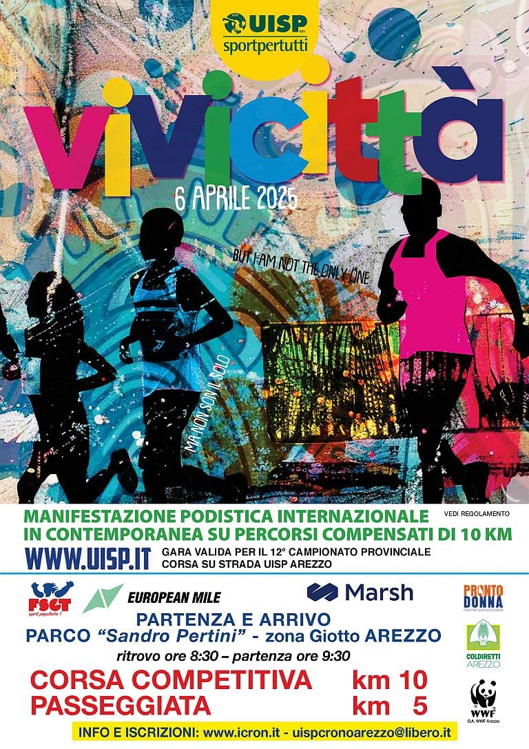 40° Vivicittà Data: 06/04/2025 Località: Arezzo (AR) 🏆 🏅 Classifica: Clicca qui 📌 Luogo: Toscana / Arezzo⏰ Orario: 09:30📍 Indirizzo: piazza sandro pertini arezzo Volantino / Regolamento
