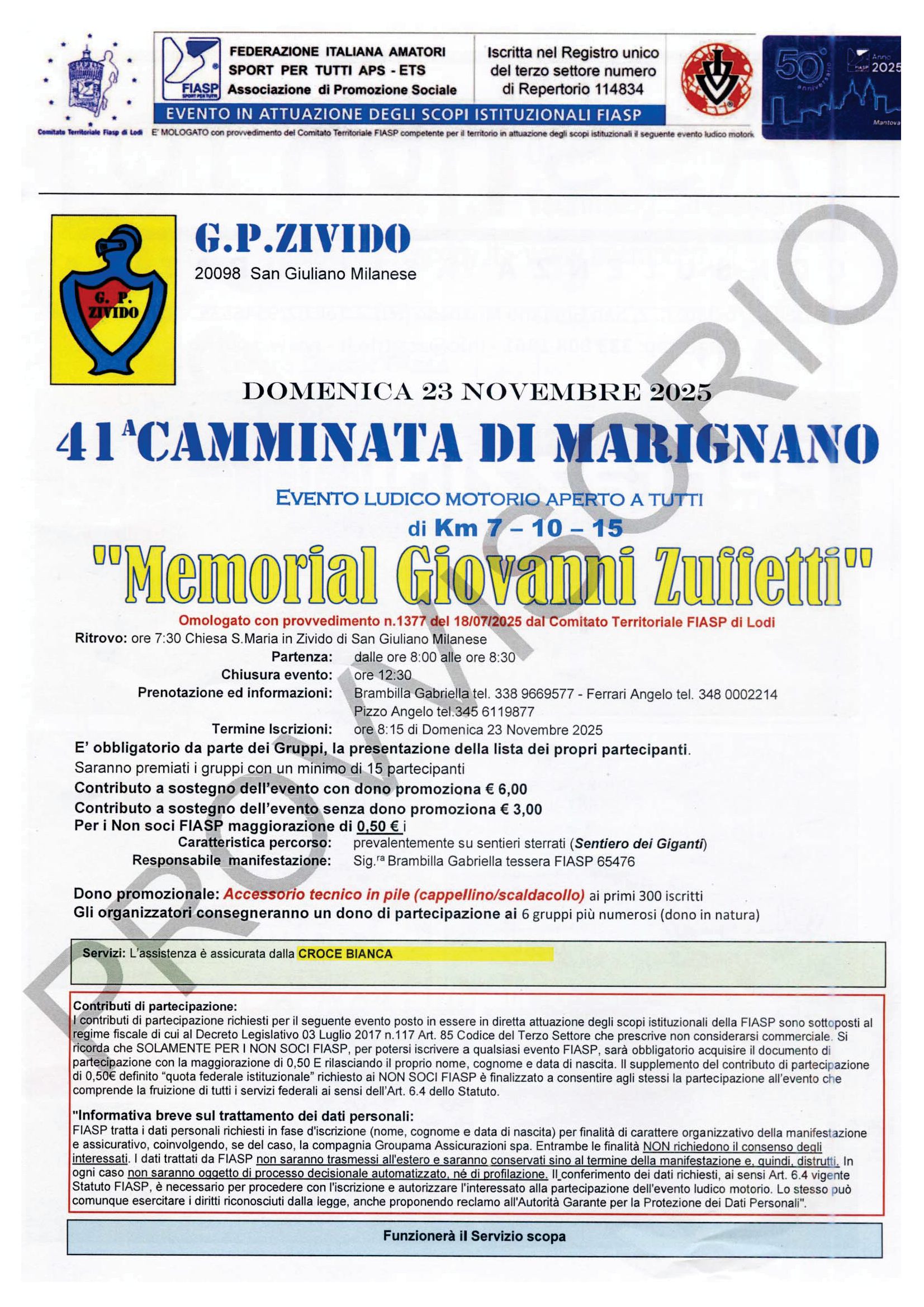 41° Camminata di Marignano Data: 23/11/2025 Località: Zivido - San Giuliano Milanese (Mi) 📌 Luogo: Lombardia / Milano📏 Distanza (max): 15 km📞 Telefono: 338.9669577 - 348.0002214 - 345.6119877Descrizione: Ludico motoria di Km 15 - 10 - 7. Partenza ore 08:00/08:30 c/o la Chiesa Santa Maria in Zivido Volantino / Regolamento