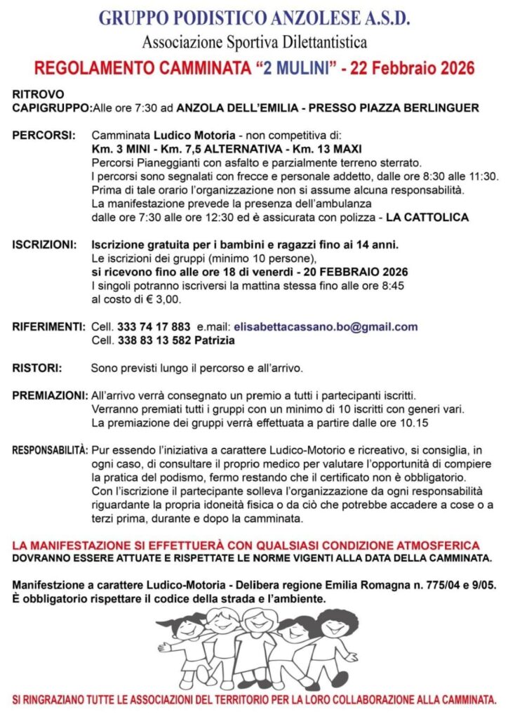 42° Camminata 2 Mulini Data: 22/02/2026 Località: Anzola dell'Emilia (Bo) 📌 Luogo: Emilia-Romagna / Bologna📏 Distanza (max): 13 km📧 Email: elisabettacassano.bo@gmail.com📞 Telefono: 333.7417883 - 338.8313582Descrizione: Ludico motoria di Km 13 - 7,5 - 3. Partenza ore 09:00 da Piazza Berlinguer Volantino / Regolamento