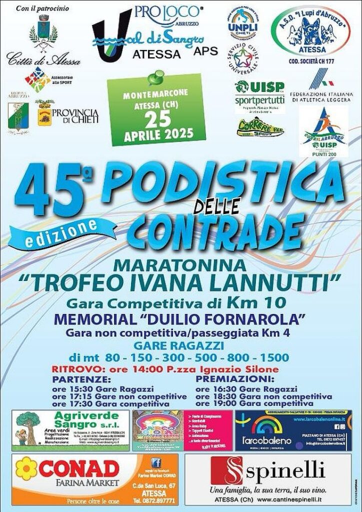 45° Podistica delle Contrade Data: 25/04/2025 Località: Chieti (CH) 🏆 🏅 Classifica: Clicca qui 📌 Luogo: Abruzzo / Chieti⏰ Orario: 17:30📍 Indirizzo: atessa Volantino / Regolamento